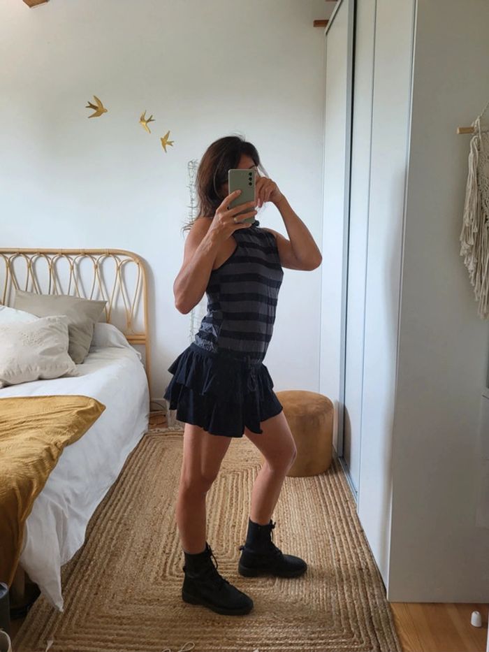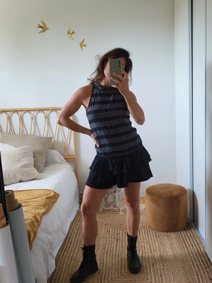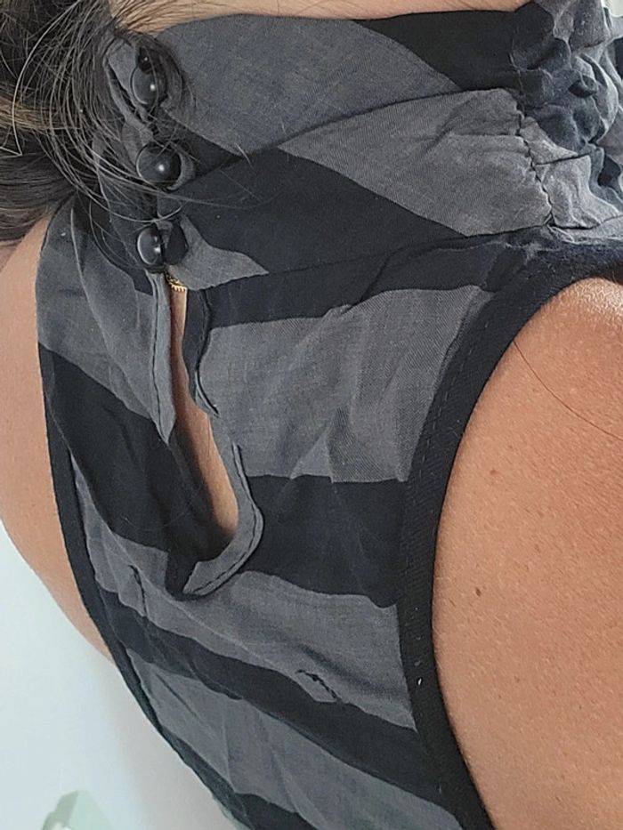 Robe courte rayée noir et gris. Dos americain. Elle s'accroche dans le cou avec trois petits boutons. Le bas est en volant noir.