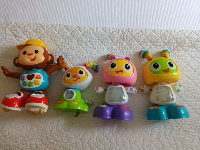 Fonctionnent tous sauf le singe, les piles sont restées à l'intérieur et sont oxydées, je le donne si vous réussissez à le réparer. Les piles seront à changer sur le Bebo, elles fonctionnent encore sur le chien et Beba. 40 € le lot