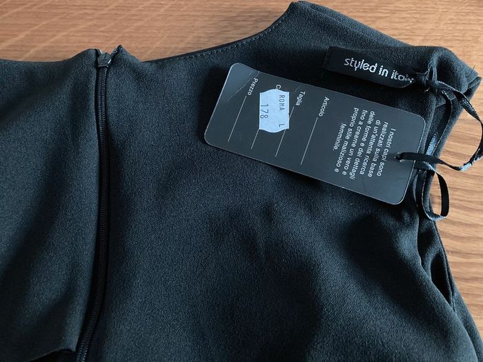 Marque "Styled in Italy", robe de cérémonie, de soirée ou de fêtes. poitrine recouverte de 8 boutons argentés style officier, fermeture zip dos, Tour de poitrine 90 cm, tour de taille 74 cm, longueur 90 cm. beau tissu extensible polyester et élasthanne.