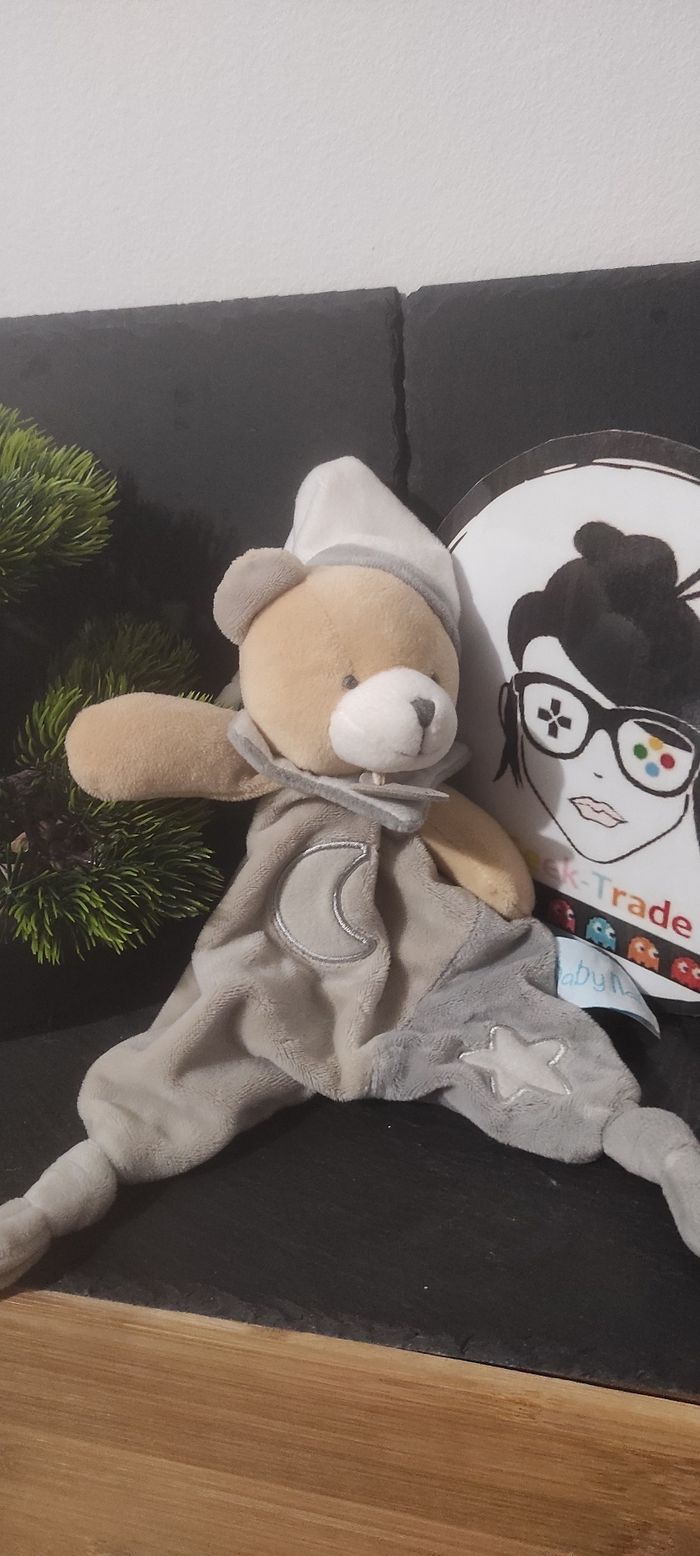 Doudou plat ours beige gris lune etoile Baby Nat BN0138  Luminescent Blanc