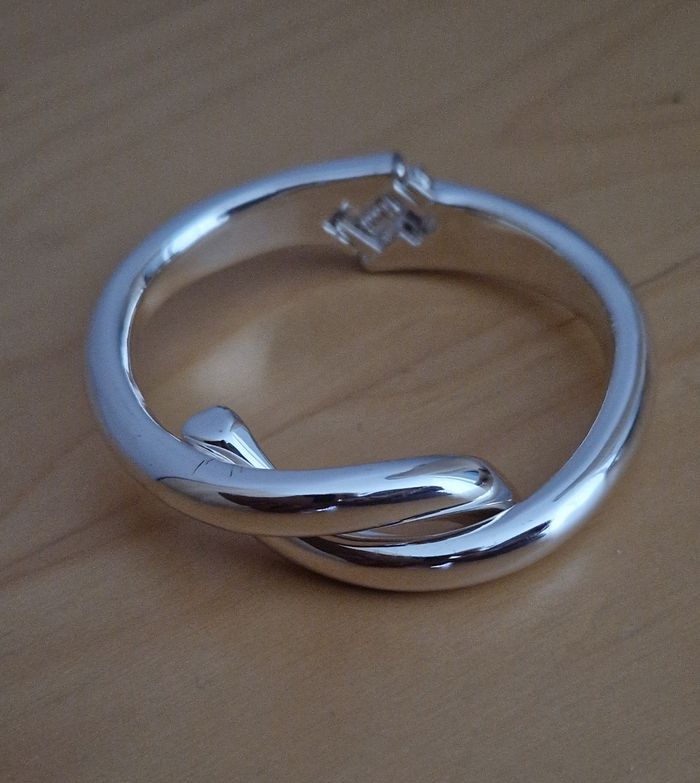 Bracelet argenté torsadé sur le dessus / Ouverture par ressort pour l'enfiler / Diamètre : 5 à 5,5 cm (le bracelet est ovale et non rond) - Très élégant et en excellent état.