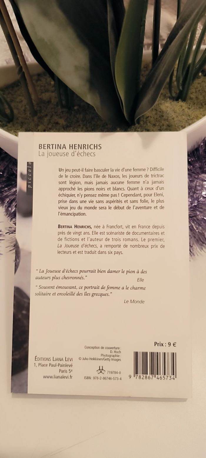 Un jeu peut-il faire basculer la vie d'une femme ? Difficile de le croire. Dans l'île de Naxos, les joueurs de trictrac sont légion, mais jamais aucune femme n'a jamais approché les pions noirs et blancs. Quant à ceux d'un échiquier, n'y pensez même pas ! Cependant, pour Eleni, prise dans une vie sans aspérités et sans folie, le plus vieux jeu du monde sera le début de l'aventure et de l'émancipation. Biographie: Bertina Henrichs, née à Francfort, vit en France depuis près de vingt ans. Elle est scénariste de documentaires et de fictions et l'auteur de trois romans. Le premier, La Joueuse d'échecs, a remporté de nombreux prix de lecteurs et est traduit dans six pays.