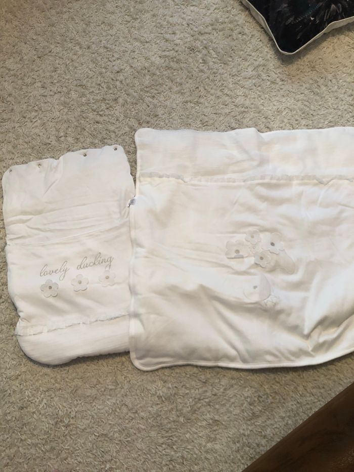 Nid d’ ange avc sa couverture et son coussin utiliser très peux de fois on très bonne état pour nouveau du jusk 3mois je dirais tous dépends comment votre enfant grandi ☺️