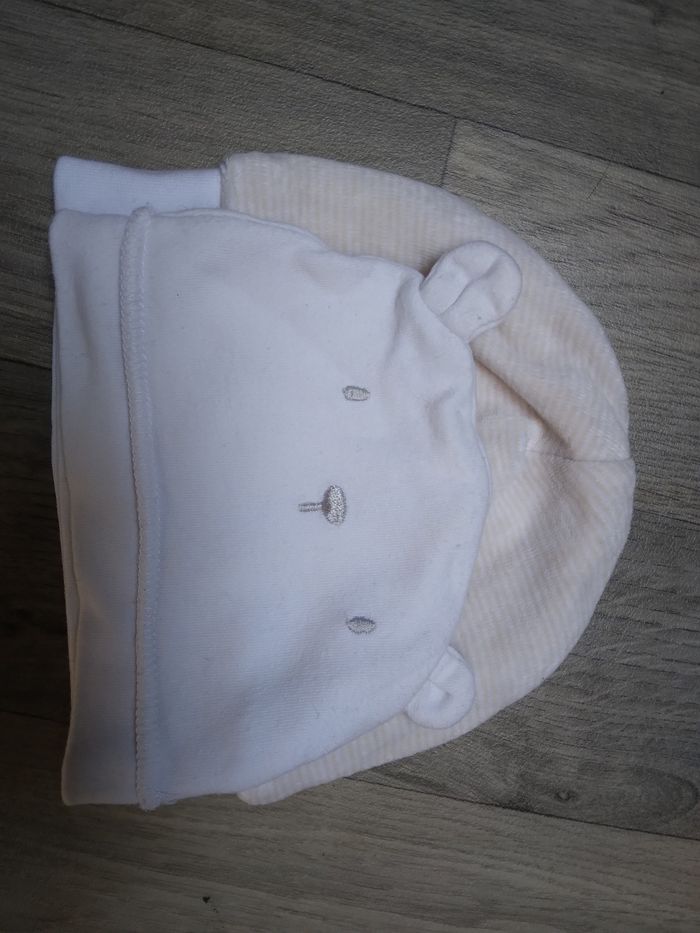 Lot de 3 bonnet bébé - 1 blanc ours - 1 blanc à pois (brioche) - 1 velours (gemo)