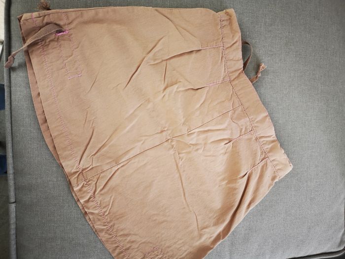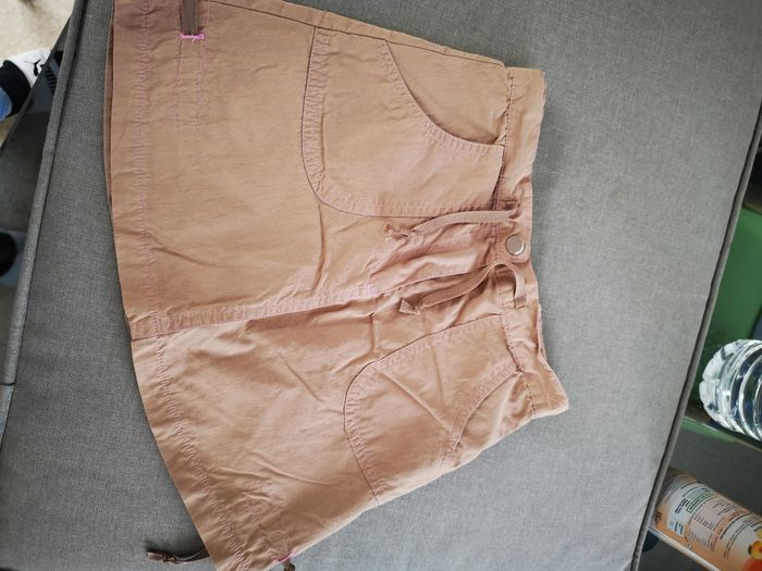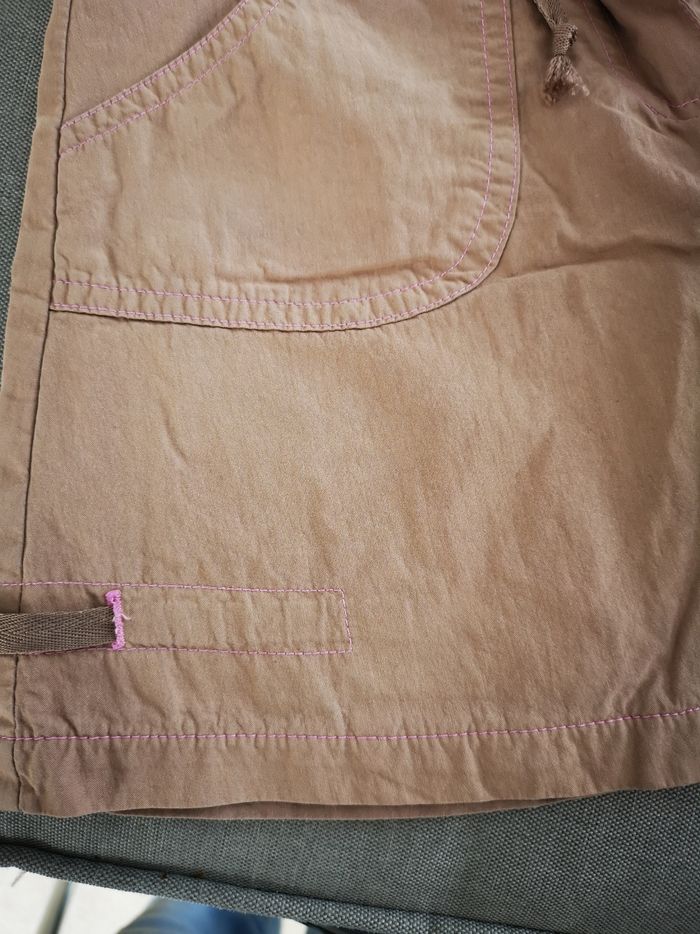 Beige avec coutures roses. 2 poches. La couleur est un peu partie sur le bouton. Ceinture réglable d'un côté