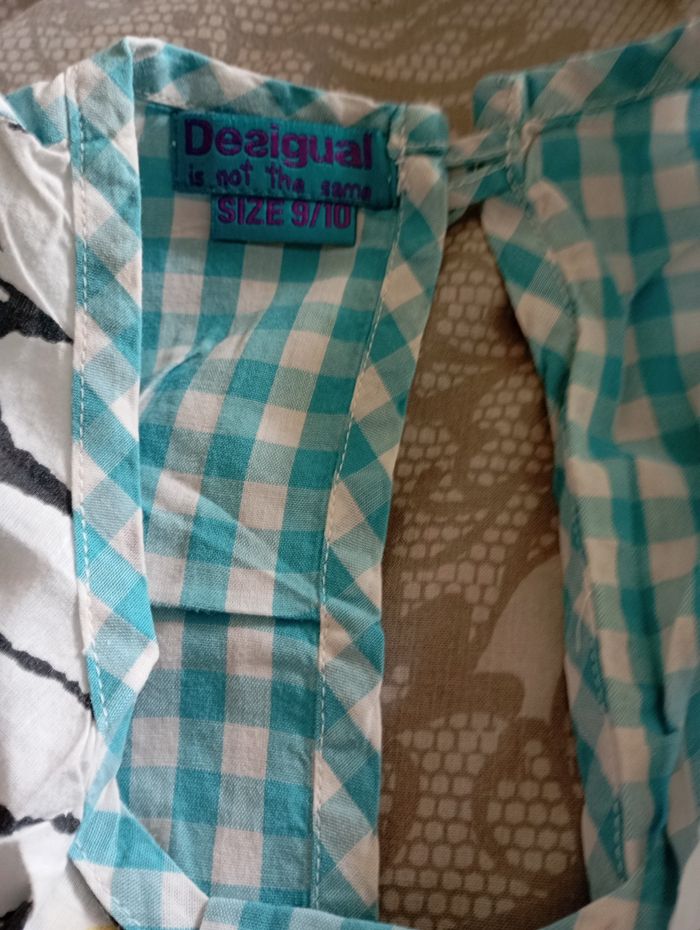 Tunique 9/10 ans fille Marque desigual Sur les tons turquoise avec chouette . Vichy haut du dos Sans manche Très bon état Bcp d'autres habits en 9 et 10 ans