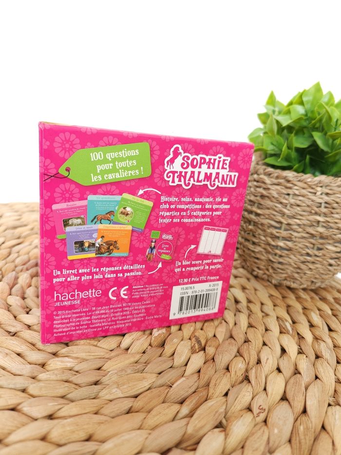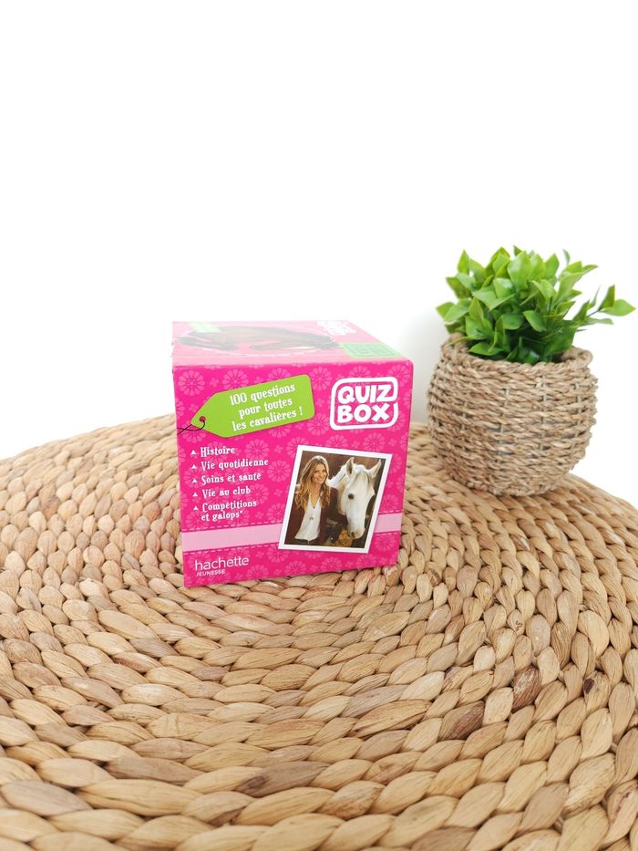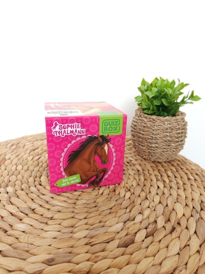 🤔 Quiz Box Sophie Thalmann 🐎 Hachette Jeunesse 🤔 🖊 ÉTAT ✅️: Neuf 🆕️ - Jamais utilisé - Dans son emballage d'origine 📦 🖊DESCRIPTION🐎: ■ Objectif: Tout connaître sur le cheval avec ce coffret de 1️⃣0️⃣0️⃣ Questions ❓️ réparties en 5️⃣ Catégories (Histoire - Soins 🩹- Anatomie - Vie au club - Compétitions 🥇 ) pour tester ses connaissances 🤔 ■ Contenu✅️: 1️⃣0️⃣0️⃣ Cartes Questions ❓️ - 1️⃣ Livret de réponse 📖 - 1️⃣ Bloc score 🏆 ■ Âge 📅: 5️⃣ ans et ➕️ 💰Prix Boutique: 12.90€💵 📕