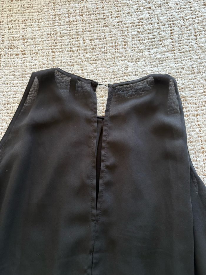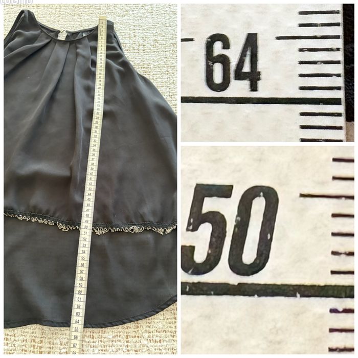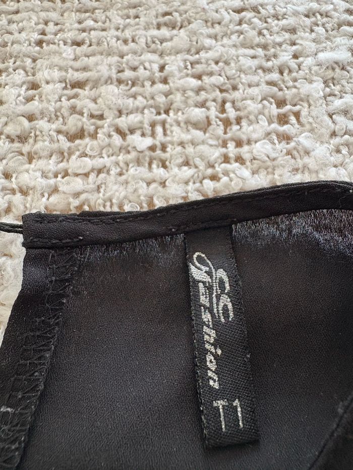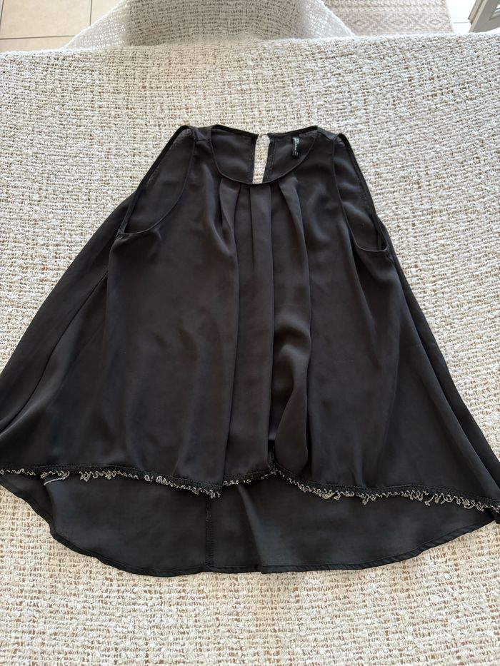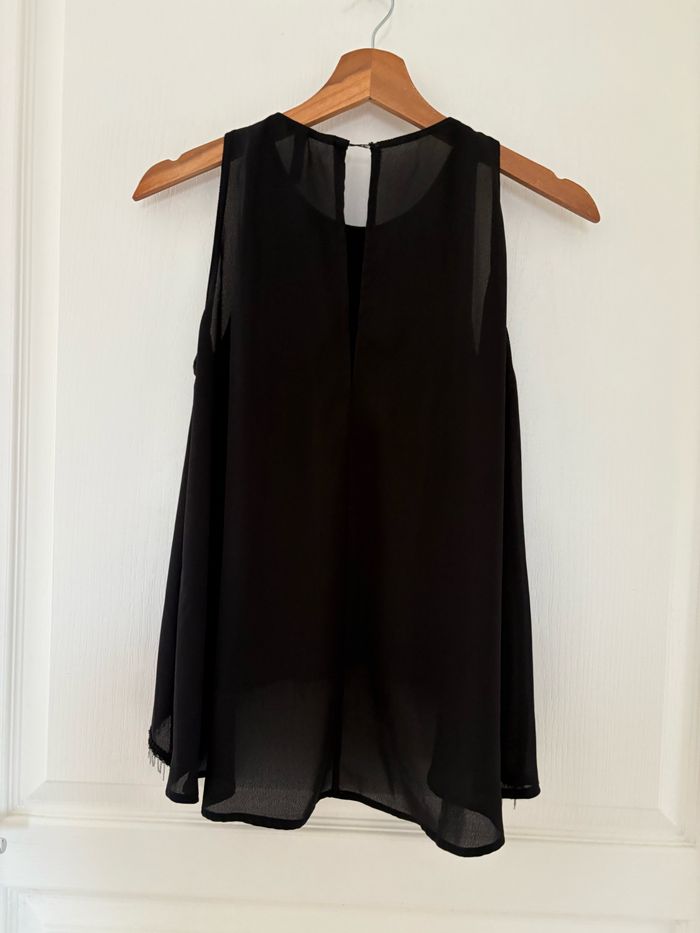 Blouse noire sans manches, franges en petite chaînette sur le bas très peux portée, taille 1 ou S TBE Largeur épaule 25 cm Largeur d’aisselles à aisselles 53 cm Longueur arrière 64 cm Longueur avant 50 cm #sandra13190femmestailleS #sandra13190femmestailleXS #sandra13190femmestailleM