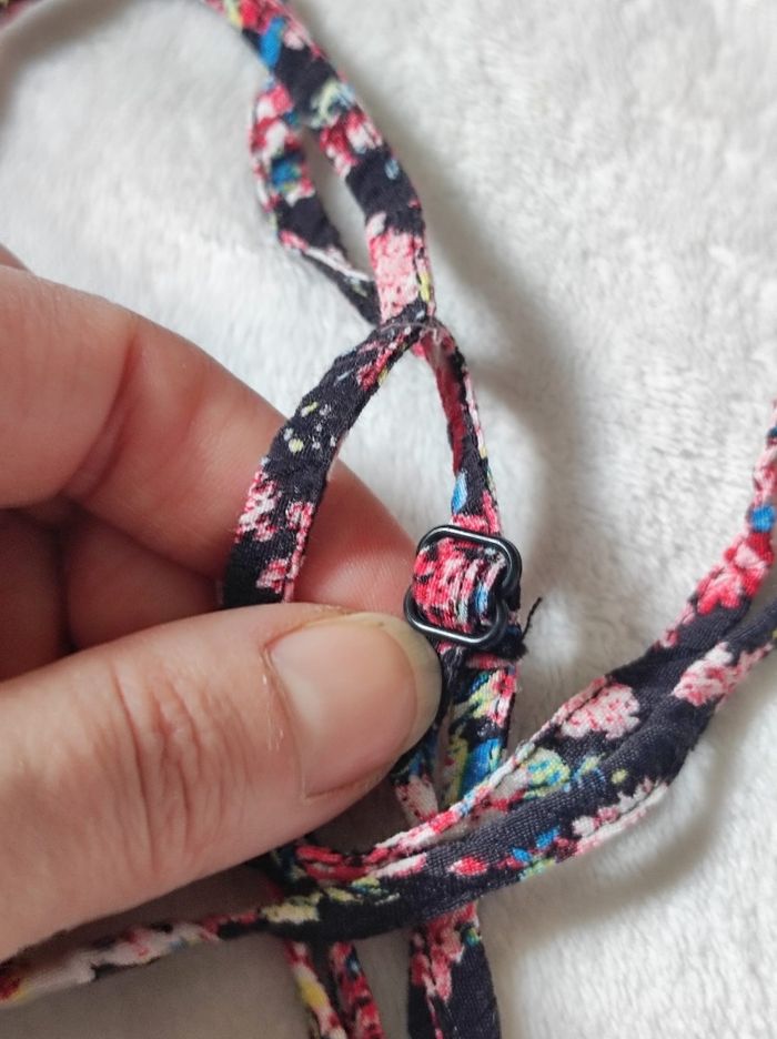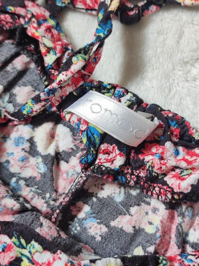 jolie petite robe courte à motifs fleuris sur fond noires. Doubles bretelles croisées dans le dos réglables. Fente sur le bord en noir transparent. Marque promod en taille 38. Peu porté en parfait état.