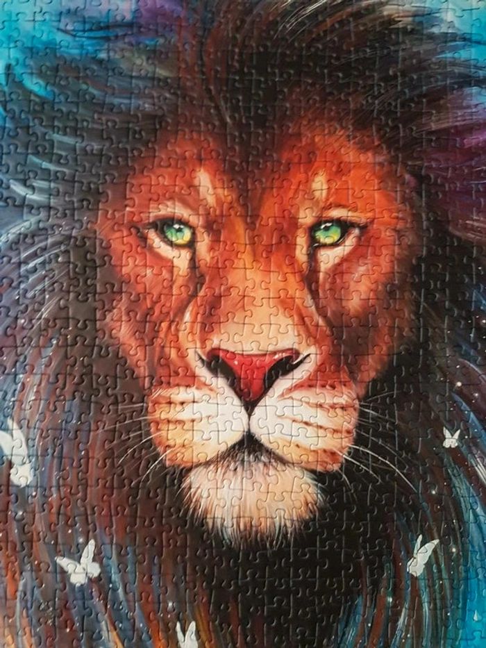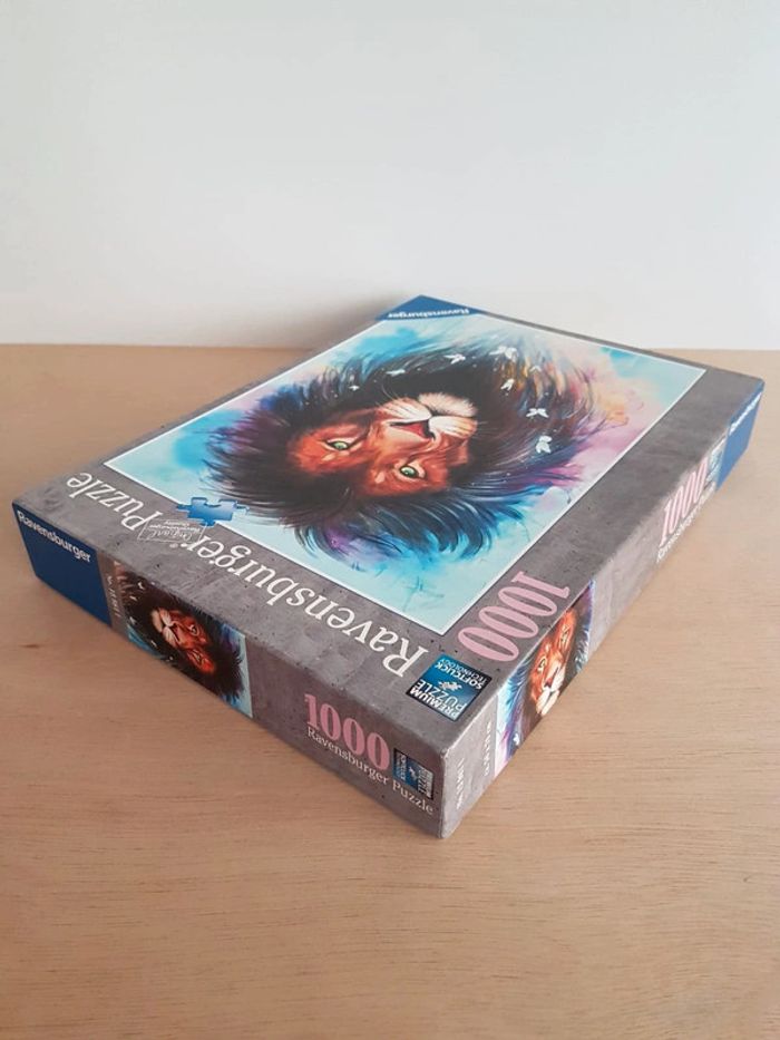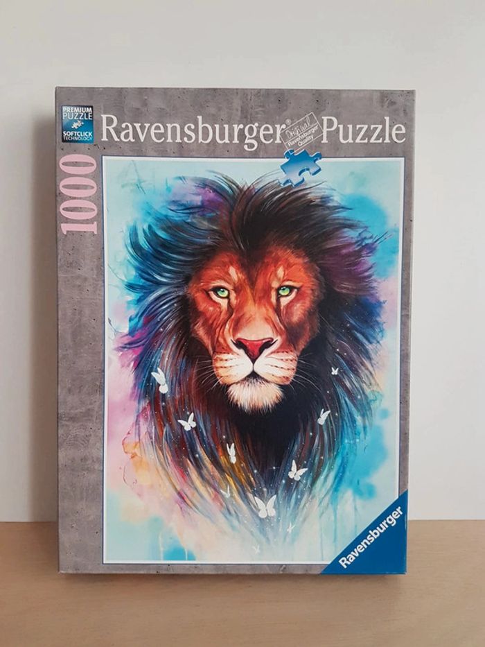 Puzzle Ravensburger de 1000 pièces COMPLET Peinture d'un lion avec effet aquarelle sur le fond, vol de papillons Format : 50 × 70 cm