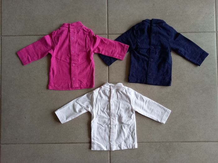 Lot de 3 sous-pulls manches longues avec pressions dans le dos, de la marque Kitchoun, pour fille, taille 3 mois. Un blanc, un rose et un bleu marine. TBE. 1,50€