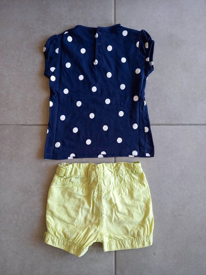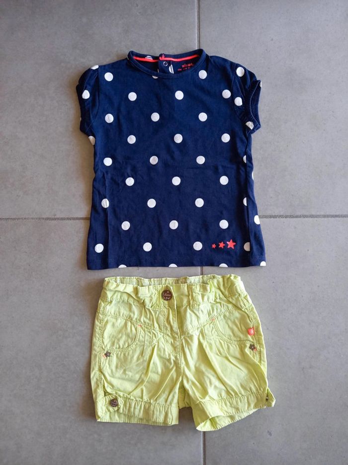 Ensemble été, marque KidKanaï, pour fille, taille 24 mois, composé d'un short vert pomme avec taille réglable par élastique et d'un t-shirt manches courtes marine à pois blancs avec pressions dans le dos. Bon état. 2€