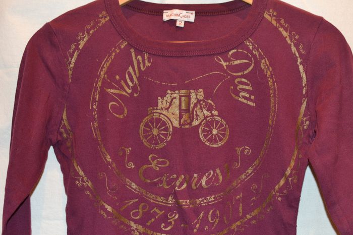 Haut violet Manches 3/4 Motif doré Col rond Très peu porté, très bon état