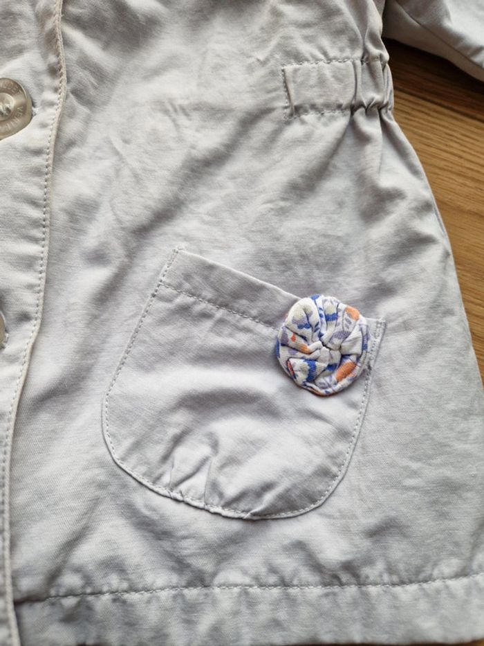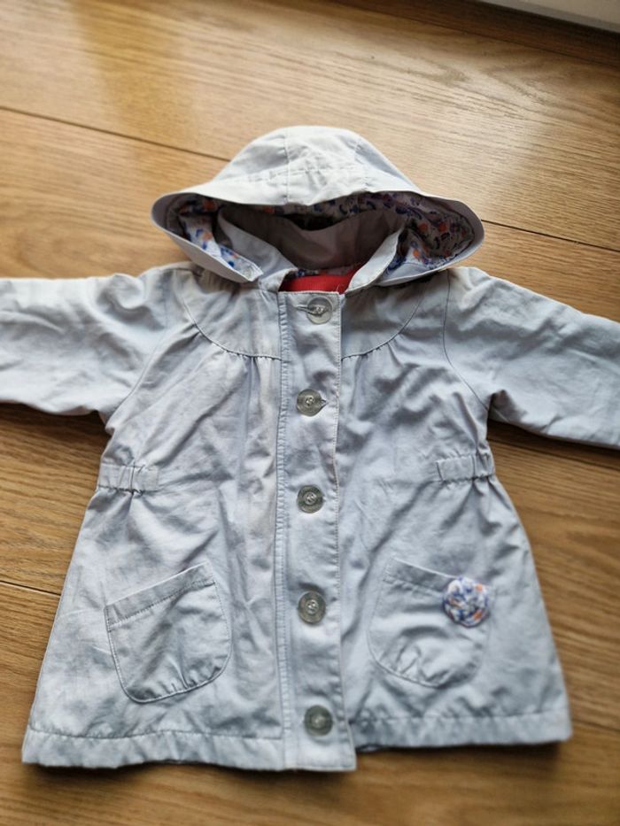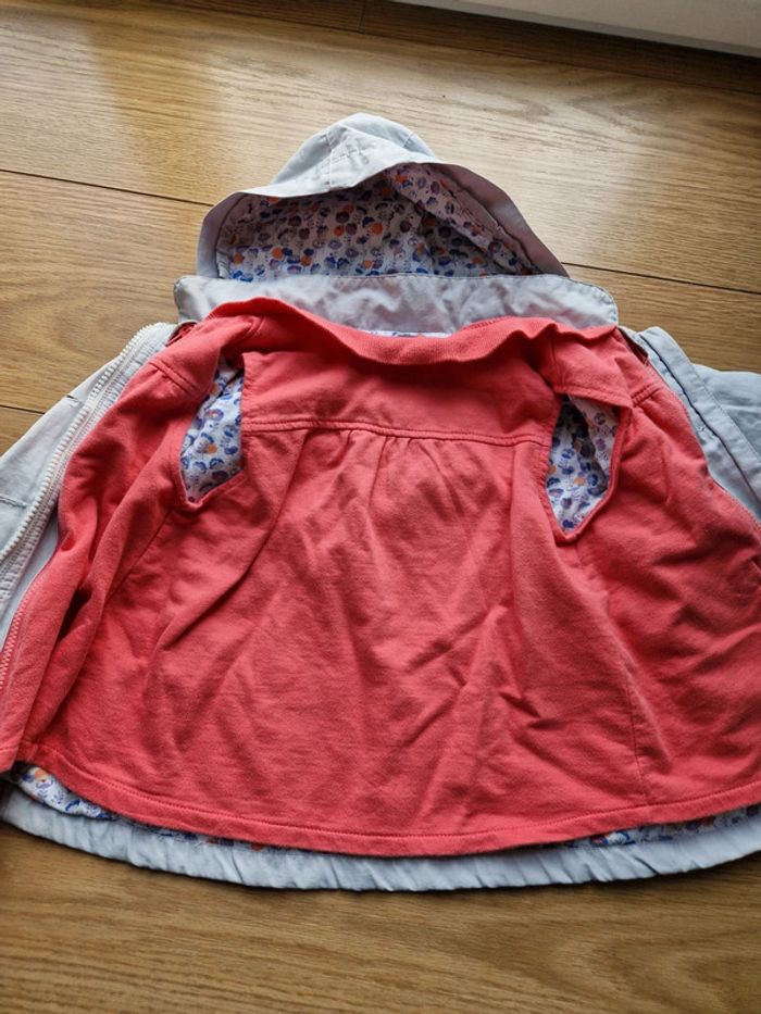 Parka veste légère 2 en 1 idéal pour le printemps ou l'automne. Style parka / coupe vent avec doublure amovible via une fermeture. Capuche amovible Matière déperlante. Gris perle Pas de défaut 18 mois