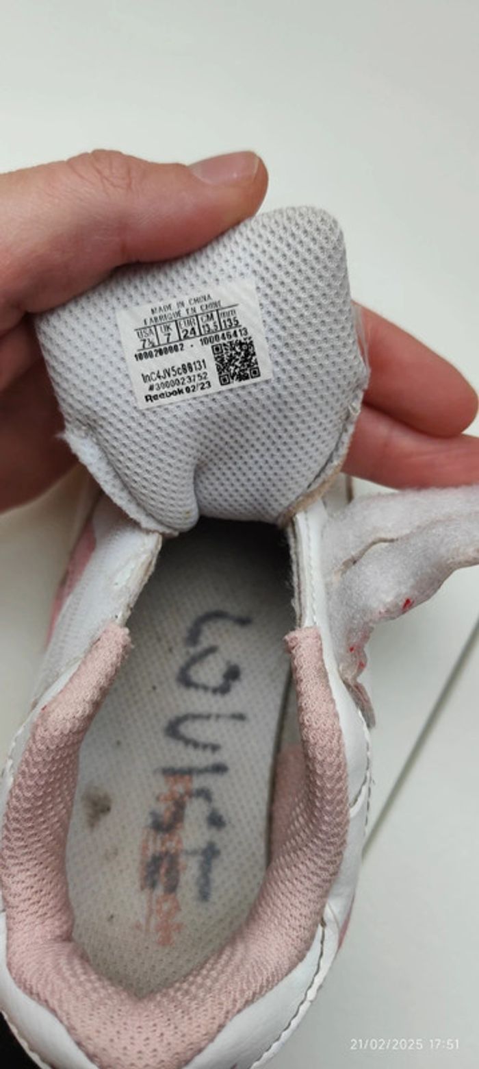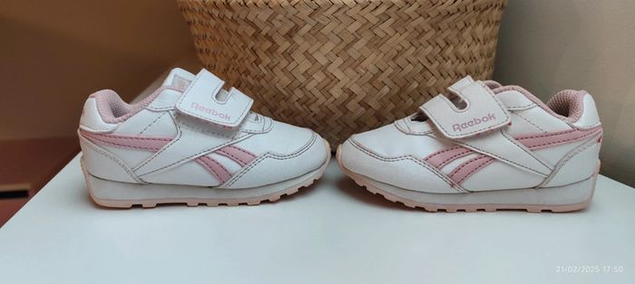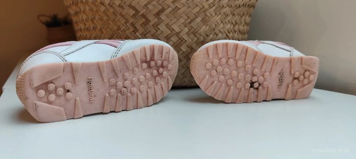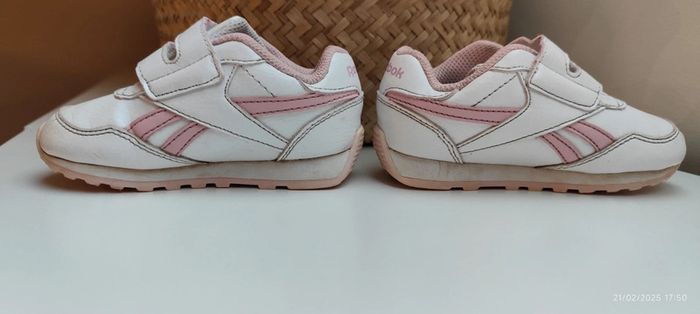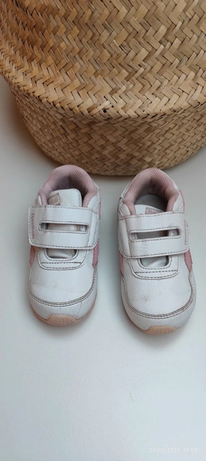 Je vends ses baskets à scratch pour petite fille de couleur blanche et rose clair, de la marque Reebok et en taille 24. #Estelle2150_enfant_chaussures