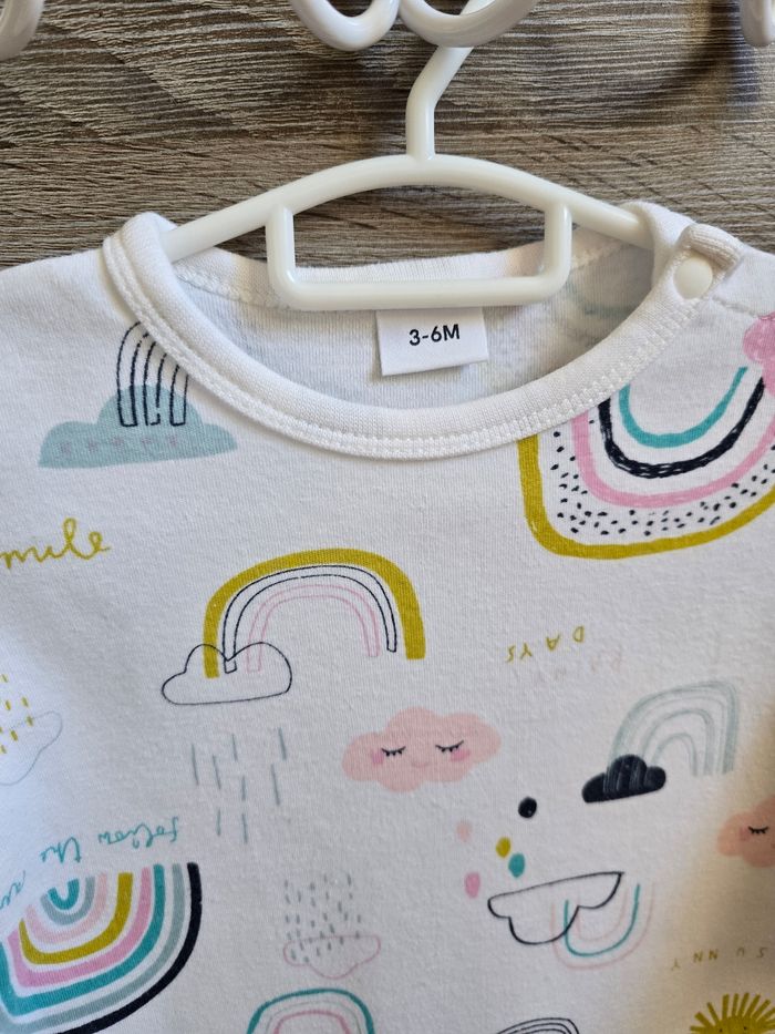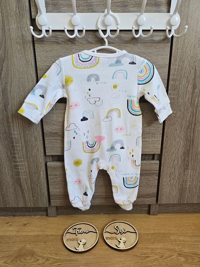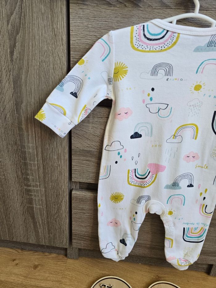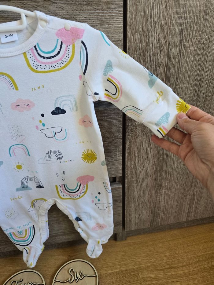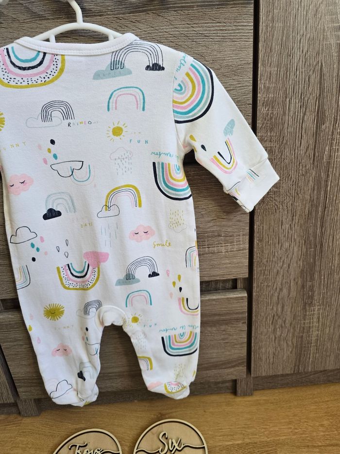 📜 Pyjama grenouillère avec des imprimés d’arc en ciel 🌈. Ouverture à l’entrejambe par des boutons de pressions. Couleur : blanc et multicolore pour les dessins.