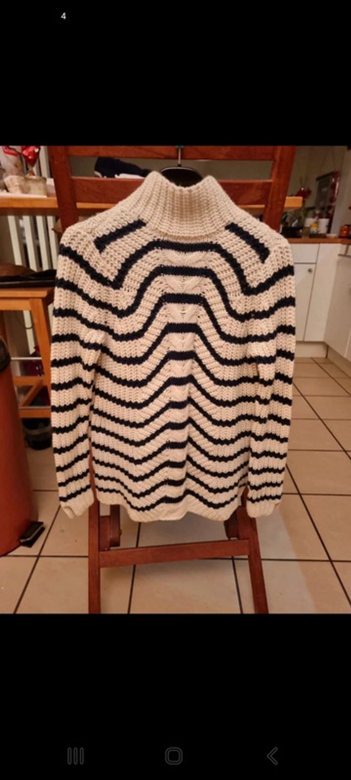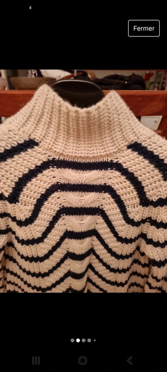 Pull neuf jamais porté Col montant. Rayures bleu marine sur fond écru. Maille côtelée et torsadée sur le devant 35% acrylique 35% nylon 20% laine 10% angora Taille S