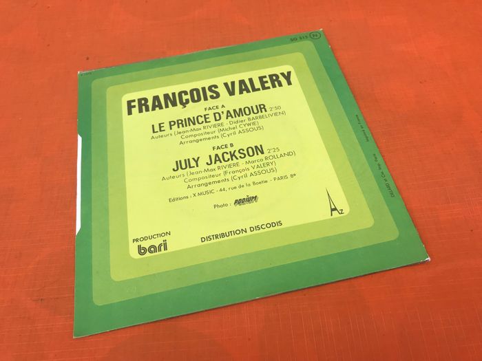 Vinyle 45 tours François Valéry Le Prince d' Amour (1974) Disc' AZ SG 515 A Le Prince d' amour Composed By – Michel Cywie Written-By – Didier Barbelivien, Jean-Max Riviere* 2:50 B July Jakson Composed By – François Valery* Written-By – Jean-Max Riviere*, Marco Rolland* 2:25