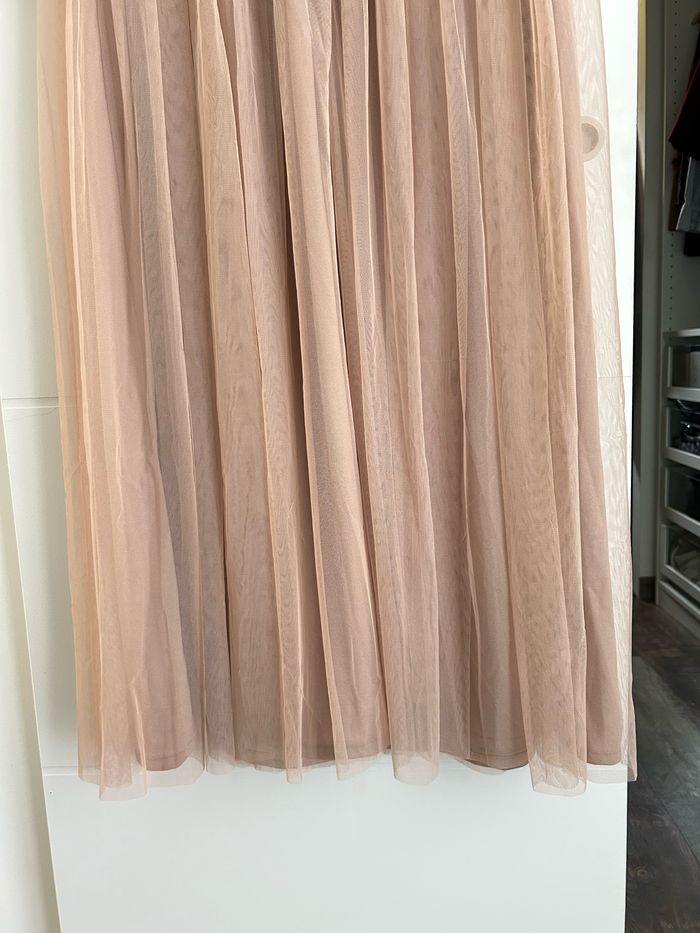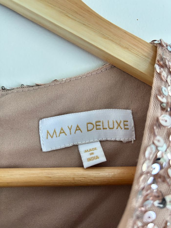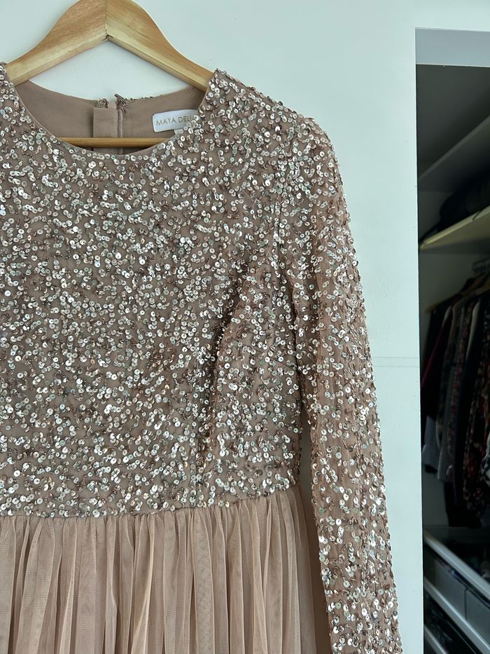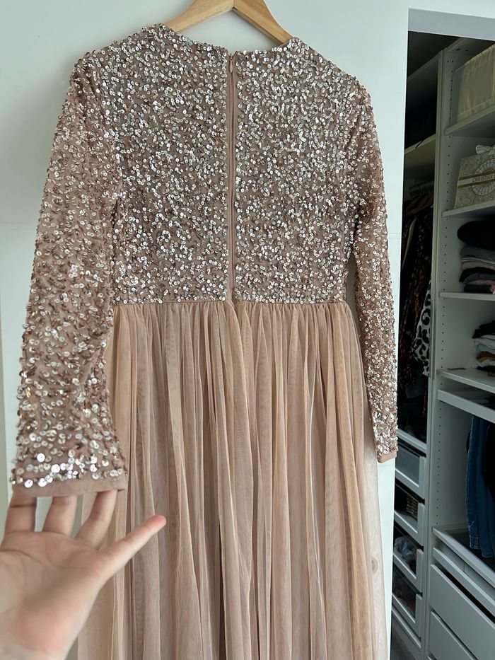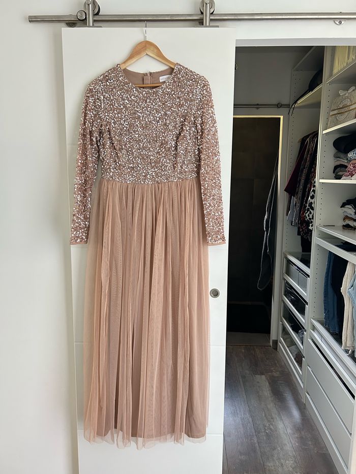 Robe Maya à sequins taille 40 porter une fois. Elle a été raccourcie par une couturière. Pour info, je fais 167 cm. La robe touche toujours le sol, mais beaucoup moins. Elle a été lavée au pressing, elle est en très bon état pour ne pas dire neuve.