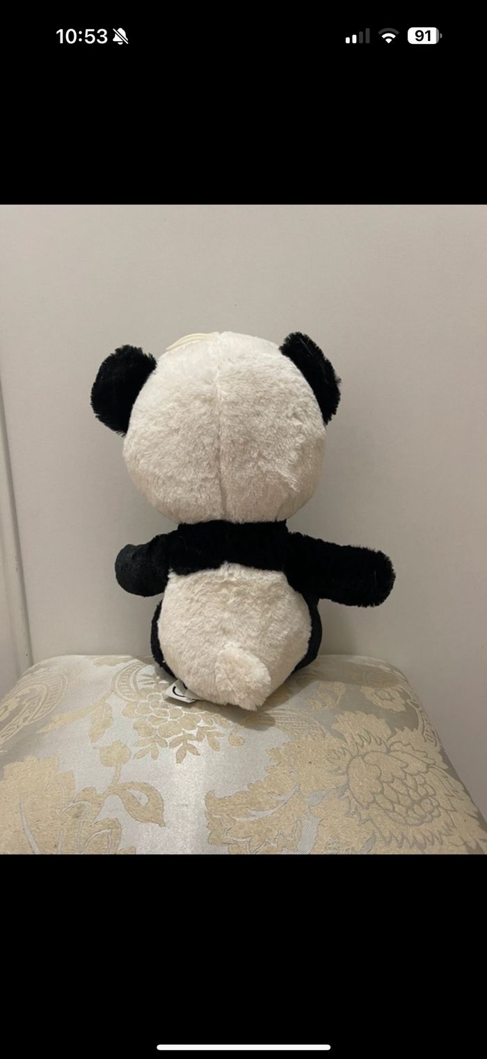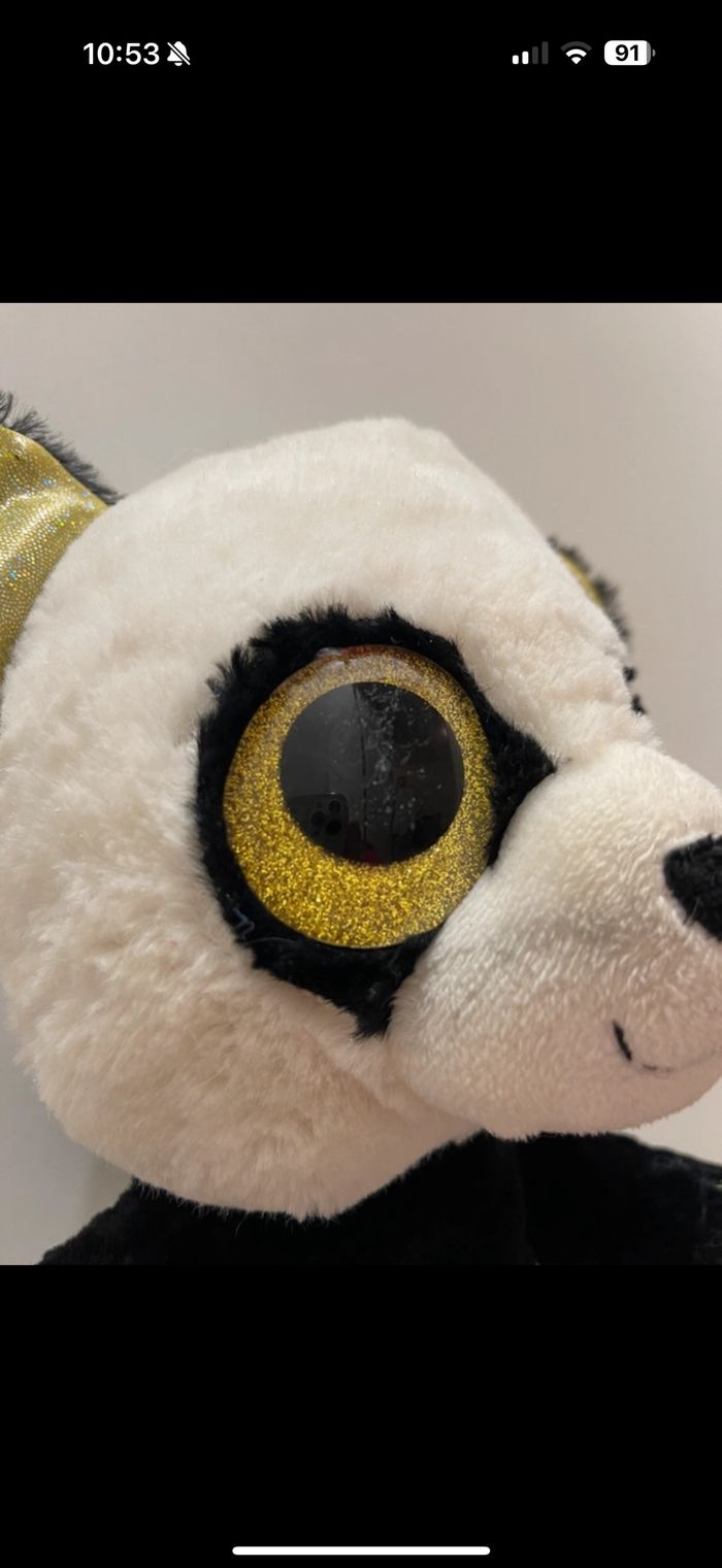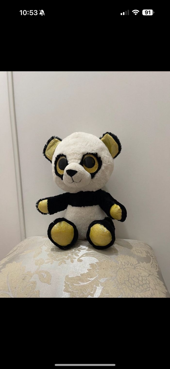 Peluche gros yeux ours noir blanc et doré un yeux est un peu abîmé voir dernière photo