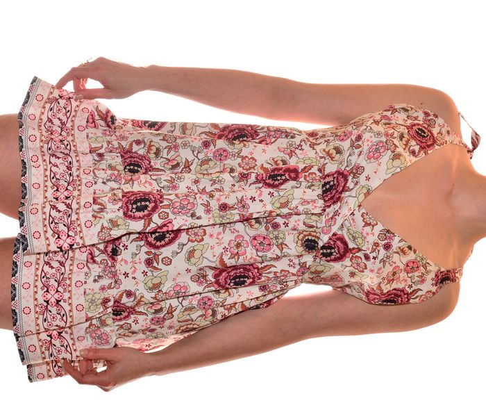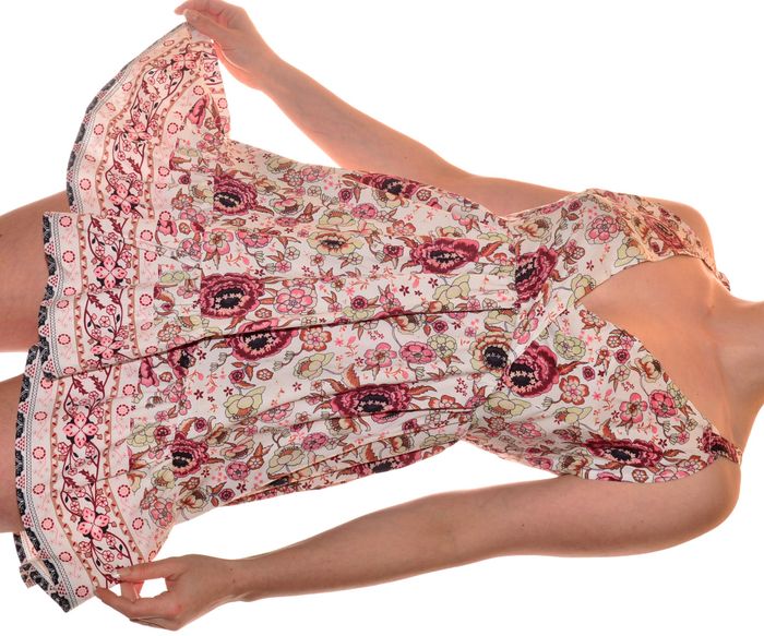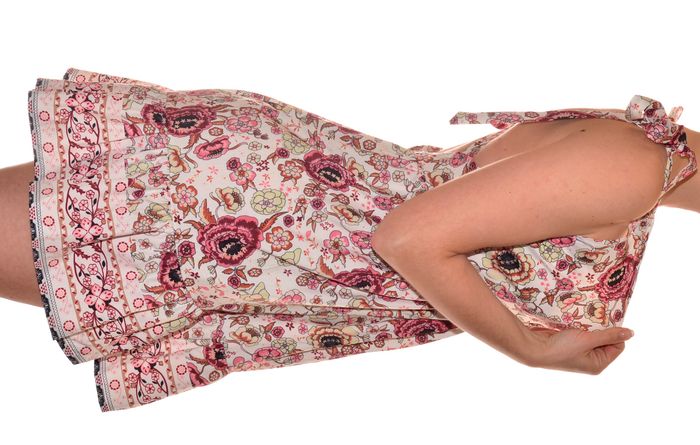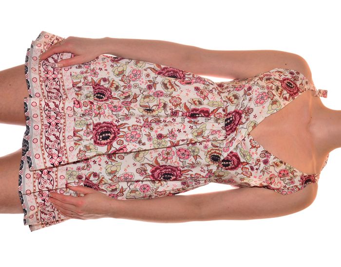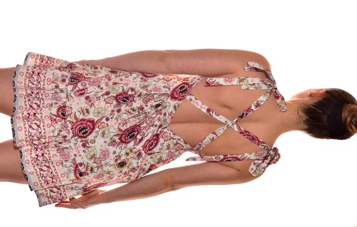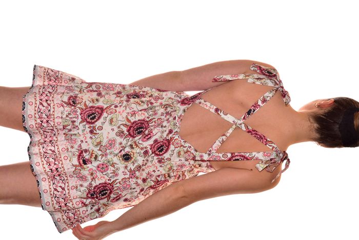 jolie robe d'été taille L col V fluide dos nu croisé et bretelles en nœuds à nouer, évasée sur le bas, taille marquée, motif floral 65% polyester 35% coton mensuration au niveau de la taille : 38 cm hanche 49,5cm largeur du bas 86 cm longueur 87 cm