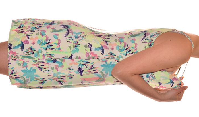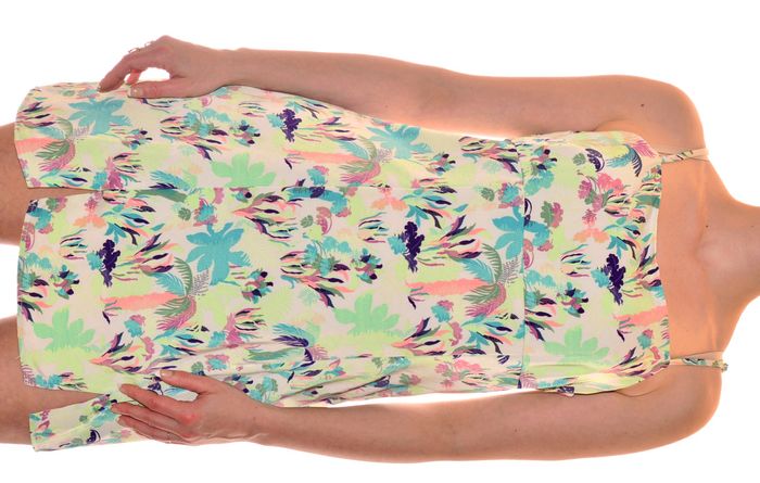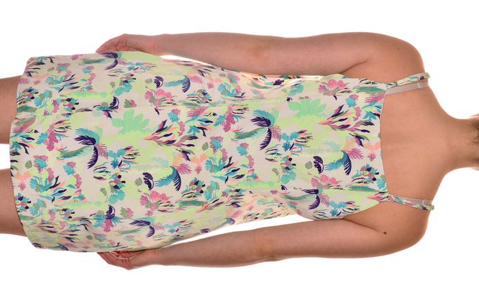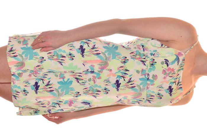 robe d'été à bretelles doublée droite col carré taille L vert multicolore motifs feuillages 95% polyester 5% élasthanne doublure 100% polyester aisselle à aisselle 45 cm au niveau de la taille 42 cm hanche 45 cm largeur du bas 56 cm longueur 81,5 cm