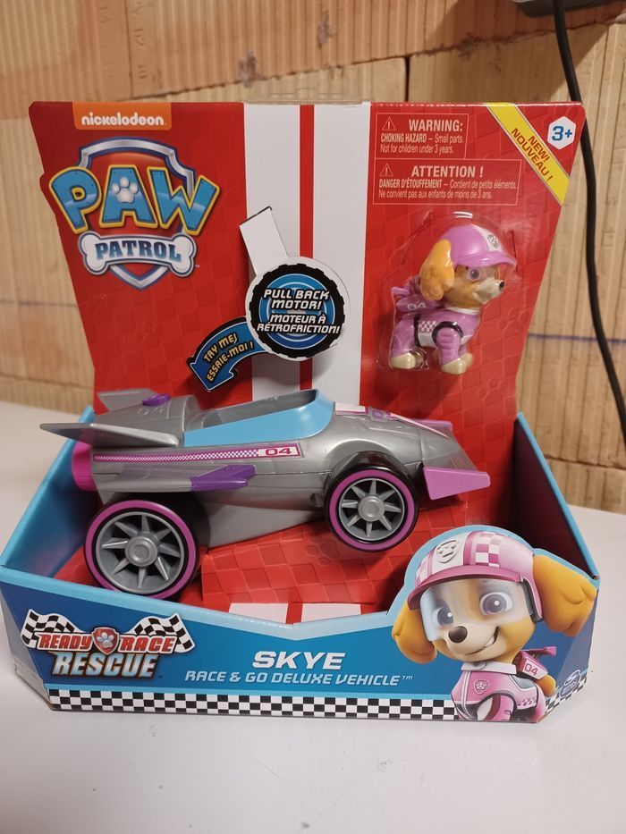 Vehicule et figurine de stella version race de la pat patrouille. Véhicule à effet sonore qui avance seul. Neuf dans son emballage