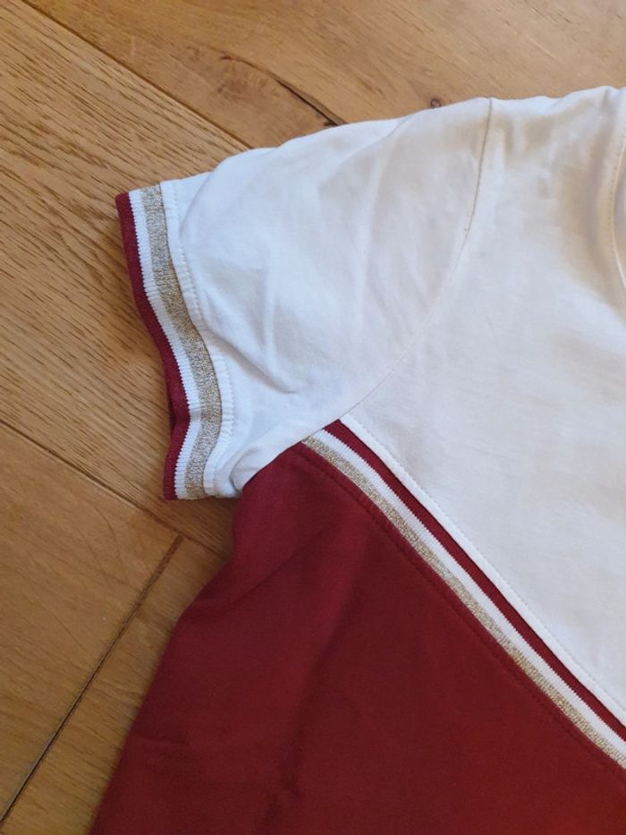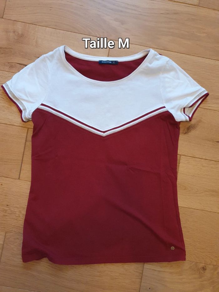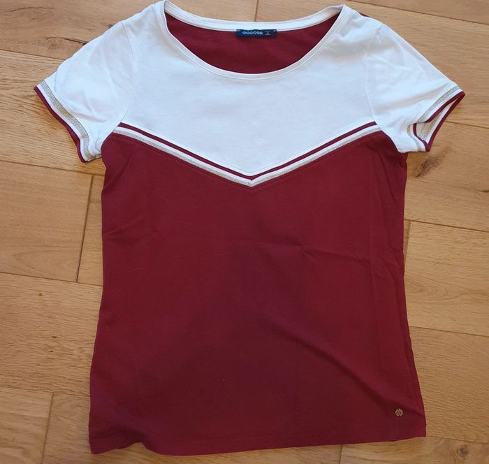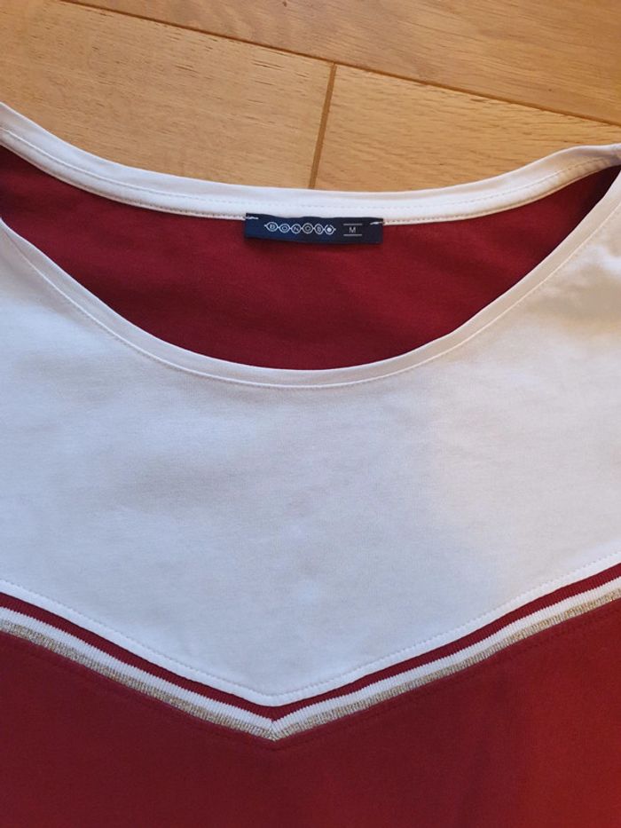 T-shirt rouge bordeaux et blanc avec liseret doré sur la poitrine et manches. Marque Bonobo Taille M, 38 Parfait état, très beau rendu