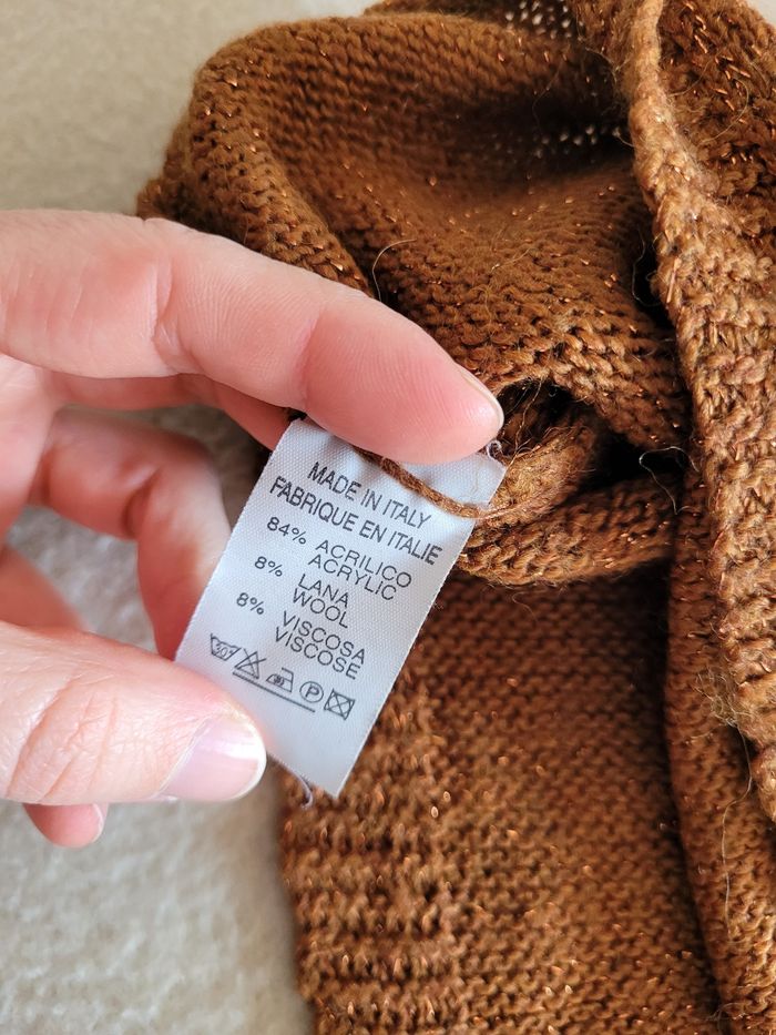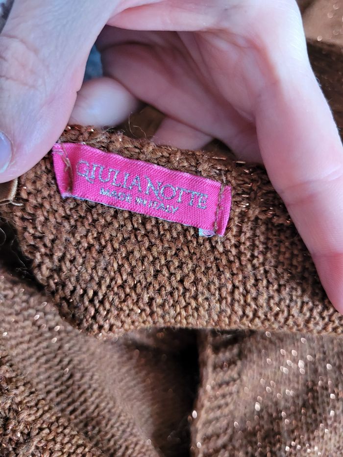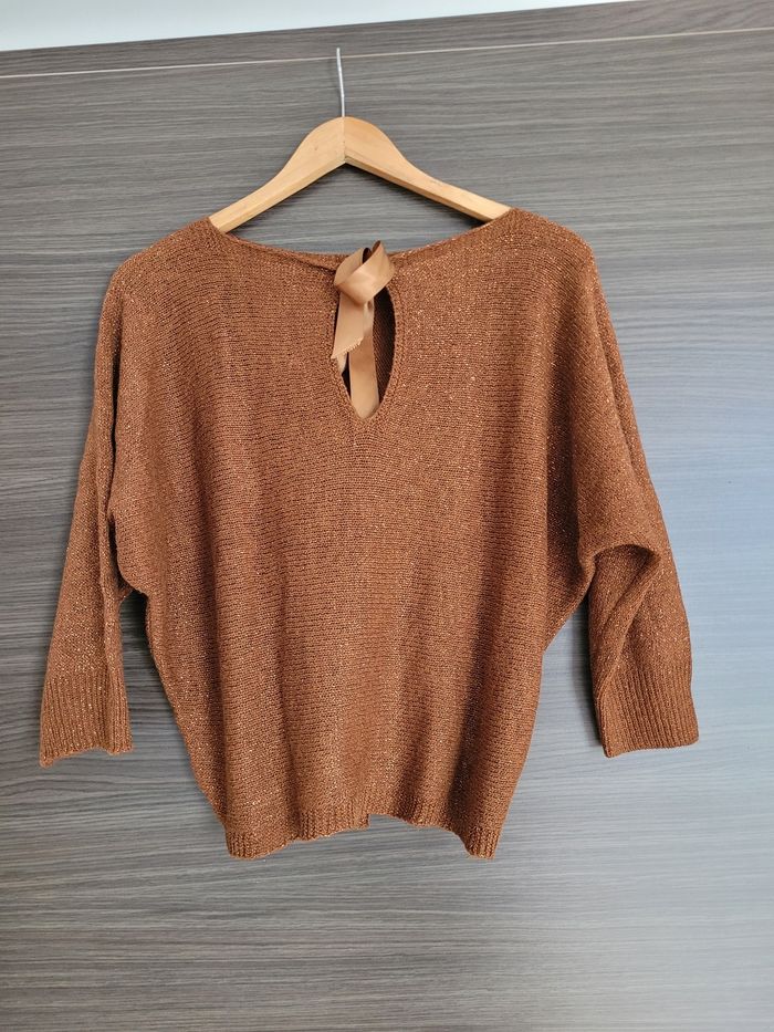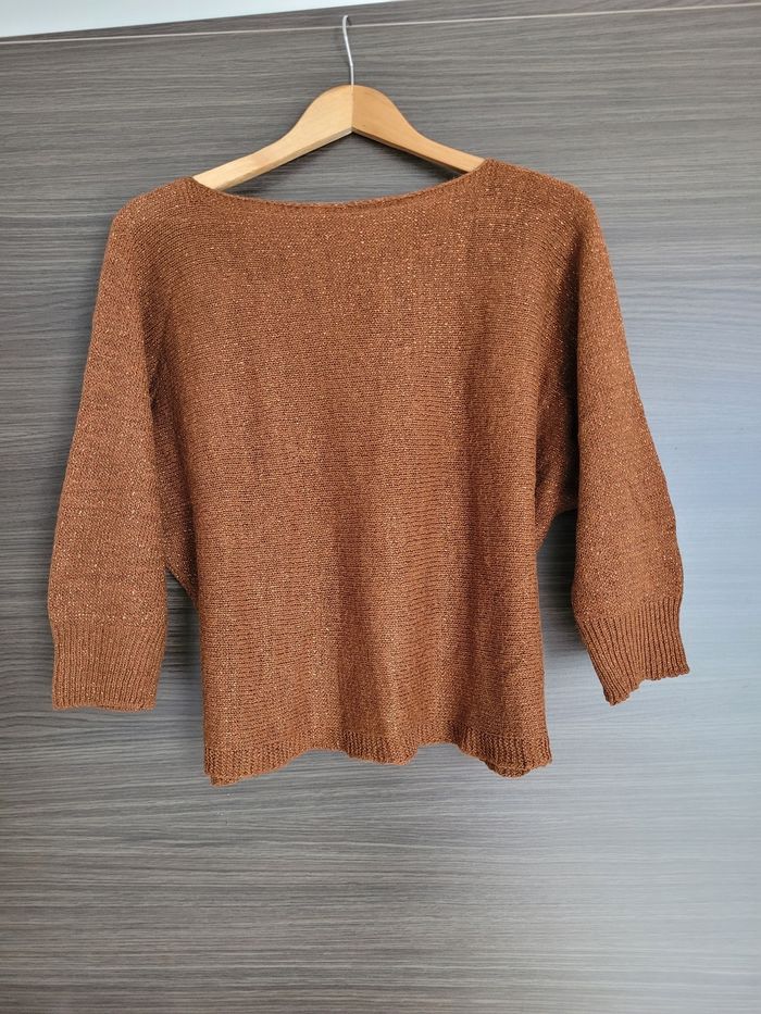 Pull giulia notte manches chauve souris Taille unique Couleur terracotta pailleté Un flot dans le dos En très bon état Largeur épaule épaule 48 cm Longueur 52 cm à partir des épaules Longueur manches 41 cm sur le côté le plus long