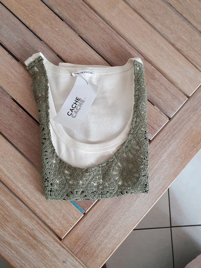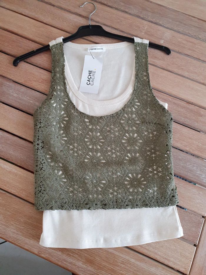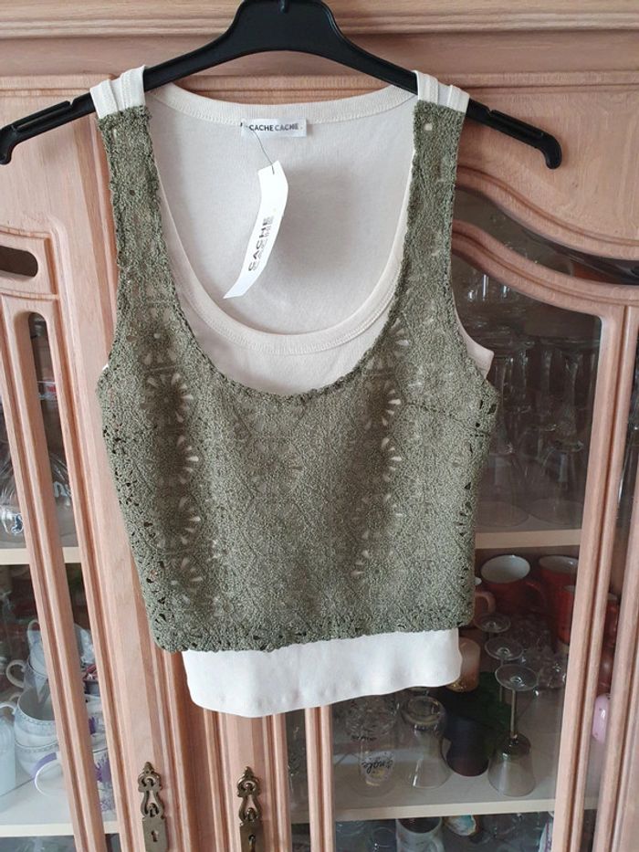 Magnifique haut débardeur Taille XS Marque Cache-cache Dessous champagne et dessus crochet Couleur sauge Les deux sont indissociables Composition dans les dernières photos