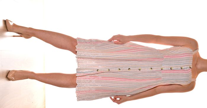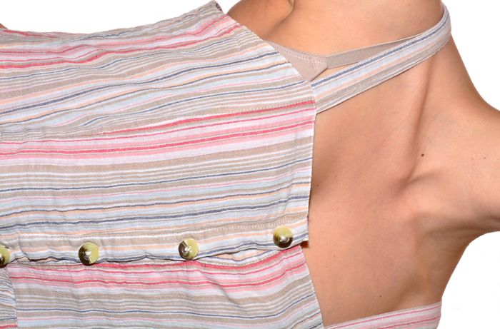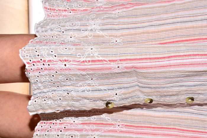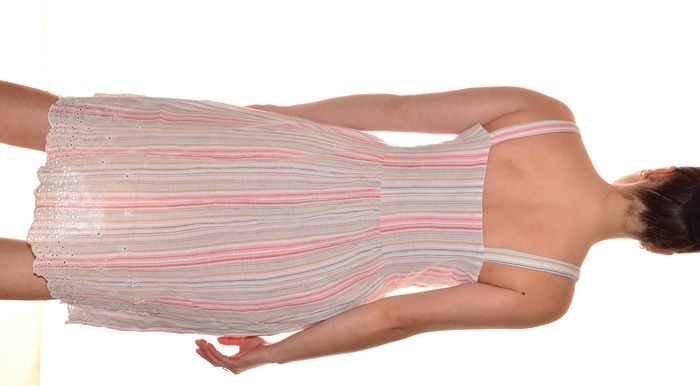 robe débardeur boutonnière longueur genoux rayées fluide couleurs pastels col carré taille L brodée sur le bas taille 42 indiqué convient à une taille 40 aisselle à aisselle 42 cm au niveau de la taille 40 cm hanche 54 cm largeur du bas 69 cm longueur 98 cm