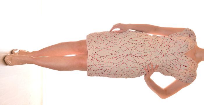 Robe casual élégante beige doublée à motifs rouge taille M col V, motifs rouge taille 42 indiqué, convient à un 38 épaule à épaule 42 cm aisselle à aisselle 46 cm au niveau de la taille 36 cm hanche 41 cm largeur du bas 47 cm longueur 89 cm