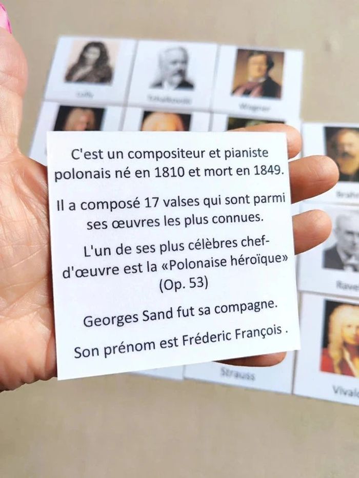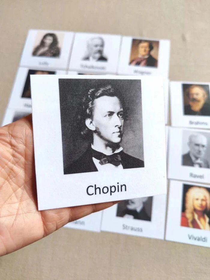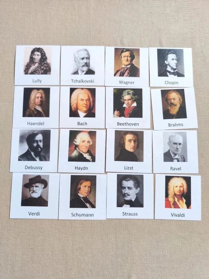 📍16 cartes de nomenclature recto verso des grands musiciens. ✨Recto : Photo du musicien avec nom. ✨Verso : Identité du musicien. 👉Papier 250G plastifié pour une bonne tenue ! 👉Taille des cartes 9 x 9,5 cm. 📍Article neuf ! 👉Pour trouver d'autres nomenclatures c'est par ici : 🔎#elisabethdesignNomenclature 📫⏳ Envoi rapide et soigné le jour même de l'achat dans la mesure du possible! 🤝 Frais de port ajusté au plus bas sur les lots.