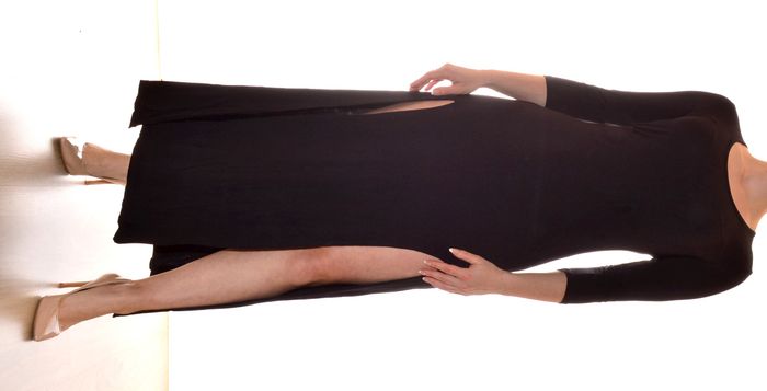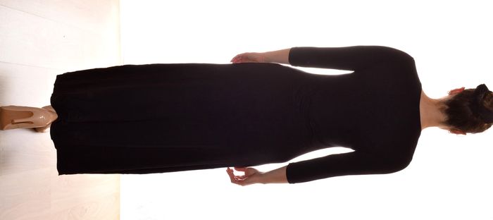 longue robe noire uni manches 3/4 moulante double fentes aux jambes taille S col rond 90% viscose 10% élasthanne épaule à épaule élastiqué au maximum 40 cm aisselle à aisselle élastiqué au maximum 48 cm au niveau de la taille sans étirer 35 cm hanche 38,5cm longueur 134 cm