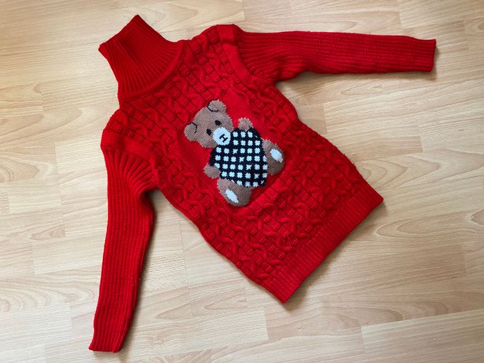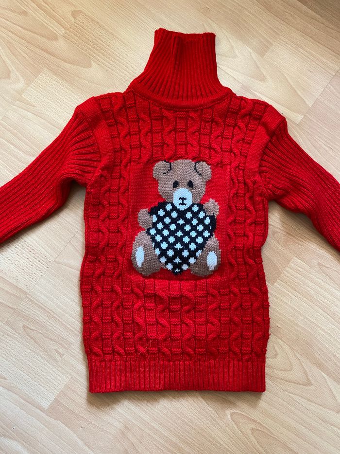 Beau pull rouge à manches longues et à col roulé motif « ourson », pour fille T. 8 ans/130 cm, en acrylique, en très bon état (l’une des coutures sur le côté est un peu décousue, voir dernière photo).