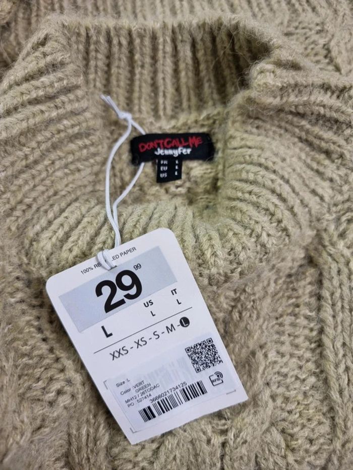 Jennyfer Pull maille torsadée Col montant Vert Taille L NEUF avec étiquette (29,99 €) 66% acrylique 21% polyester 16% polyamide 9% laine Longueur: 47 cm Taille poitrine à plat: 50 cm #jennyfer #pullcourtmaille ADN.248
