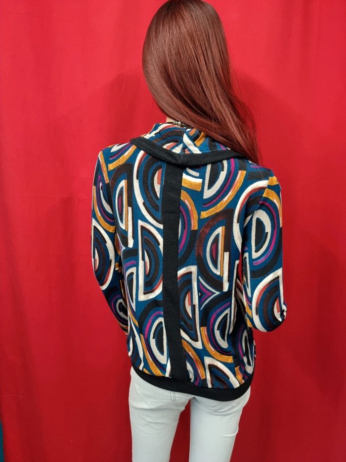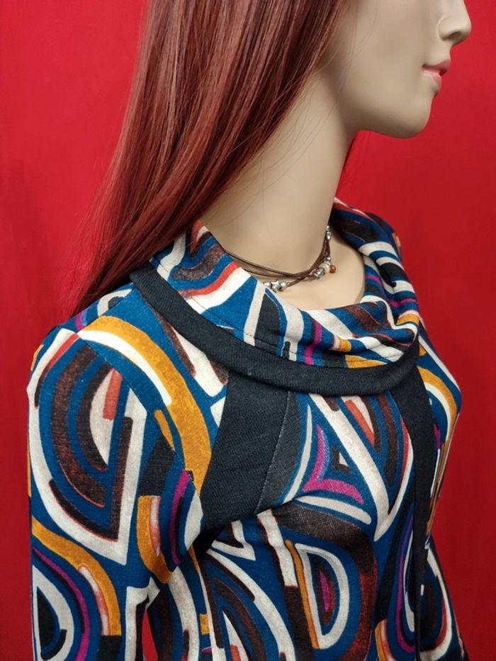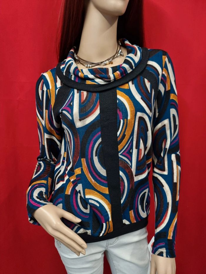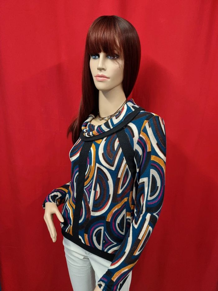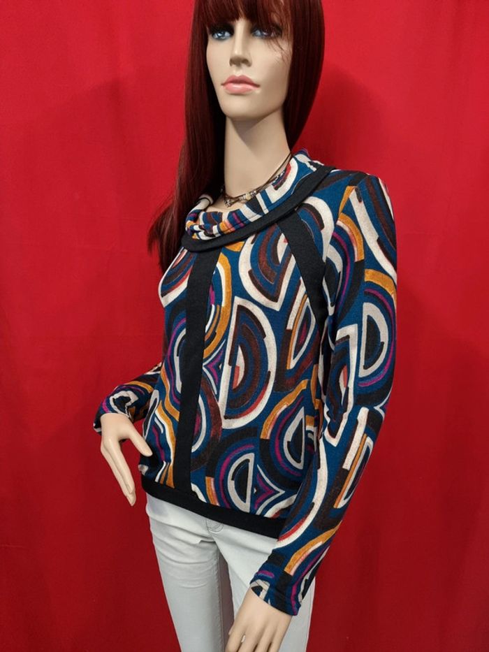Christine Laure T-shirt doux motif noir Référence : 24HE4208248 Taille 1 Neuf avec étiquette (Vendu 69,95€ collection hiver 2024) Description et composition - T-shirt noir à motifs géométriques - Coupe droite - Manches longues avec petit bord-côte - Encolure ronde - Col boule avec détails rappel motif - Fond noir et motif géométrique bleu, jaune et violet - T-shirt structuré par un bord-côte et des bandes noires de tissu épais et doux - Tissu doux et stretch - Un t-shirt d'automne douillet au motif un brin vintage parfait pour rester au chaud ; à porter à même la peau Composition : 95% polyester, 5% élasthanne Longueur: 58 cm Aisselle à aisselle: 49 cm #christinelaure #blouse #pullhiver #tshirtchaud CC.478