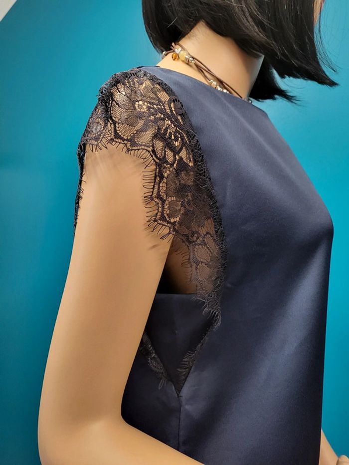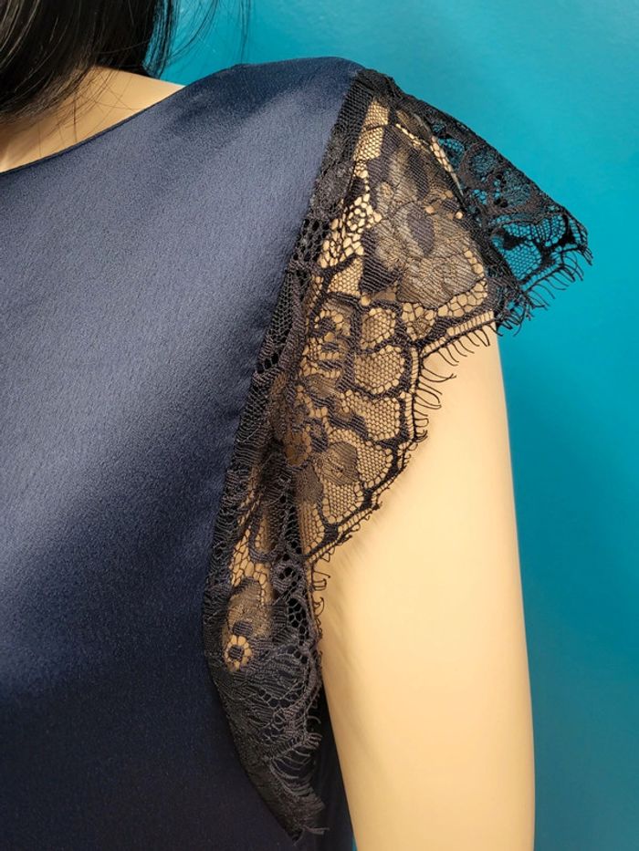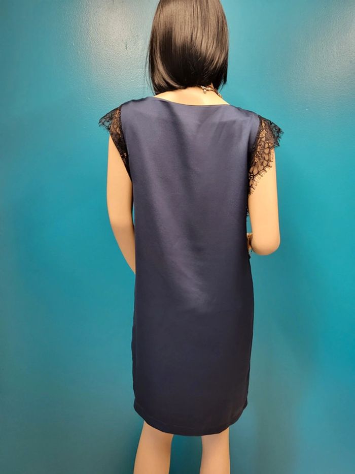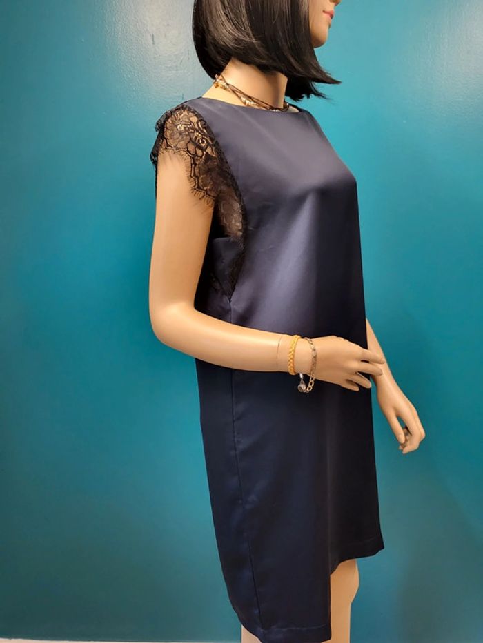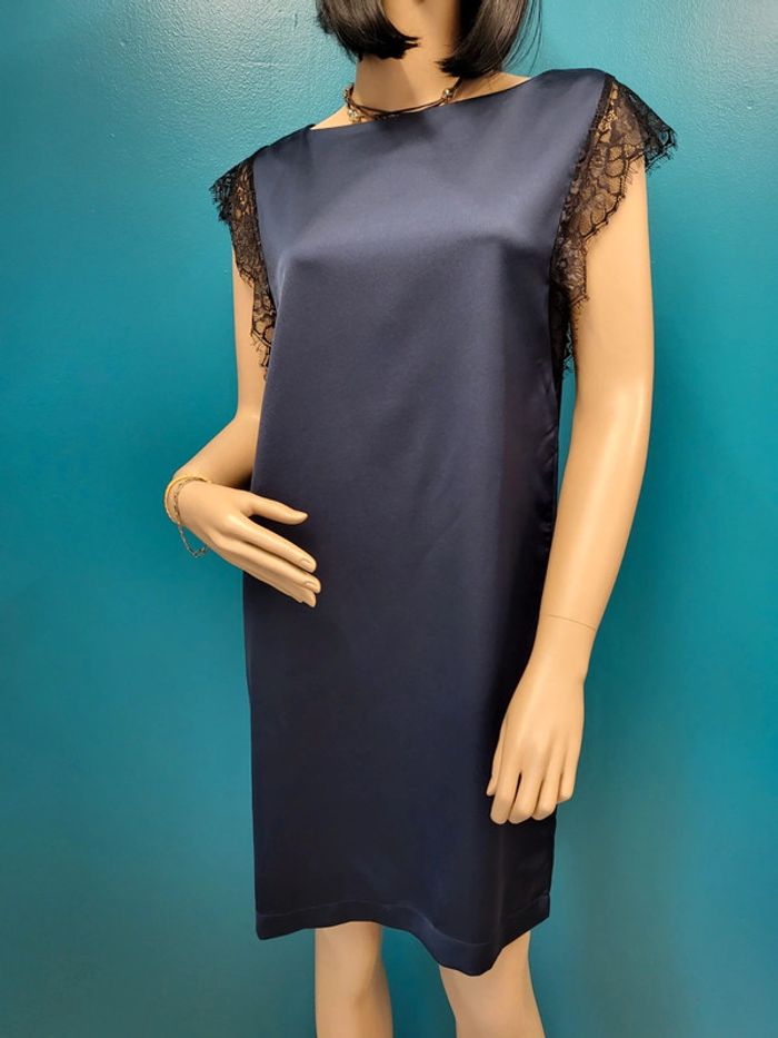 Camaïeu Robe satinée bleu marine Taille 38 Très élégante et fluide Longueur: 90 cm Aisselle à aisselle: 46 cm Dentelle noire sur épaules Comme neuve #camaïeu #robebleumarine38