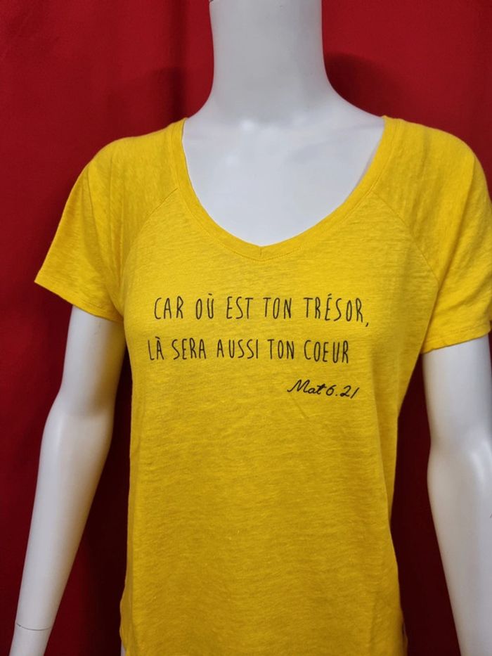Pitiwood La boutique éthique et inspirée Tee-shirt 100% lin extensible et très doux Taille L Jaune vif avec inscription Neuf, jamais porté Longueur: 60 cm Aisselle à aisselle : 49 cm #pitiwood #tshirtlinfemme ADN.870