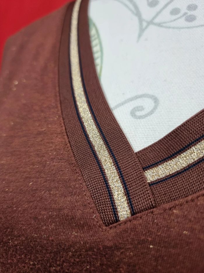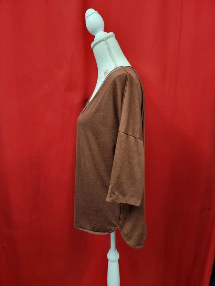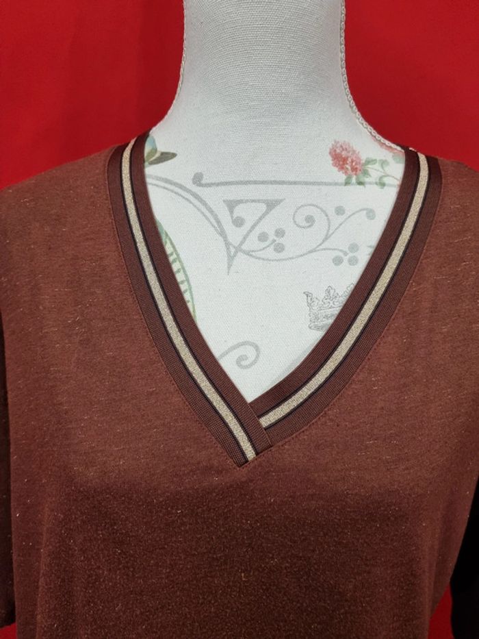 Camaïeu Blouse marron + fils dorés Taille XL Col V Manches 3/4 Parfait état Longueur : 64 cm Taille poitrine à plat: 58 cm #camaïeu #blousemarron VG.2