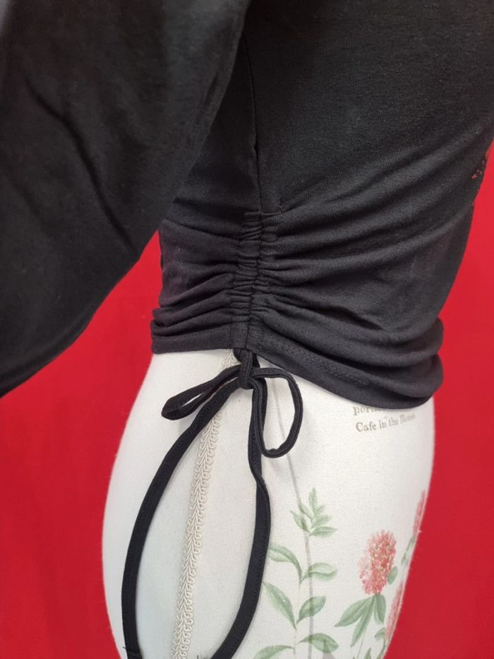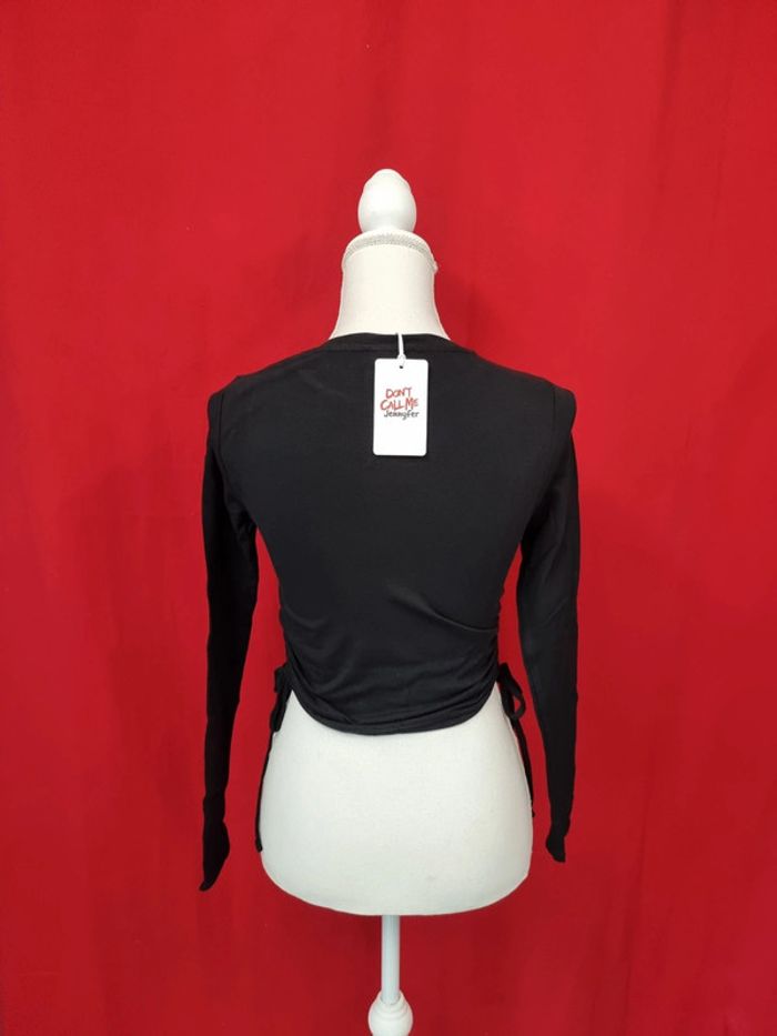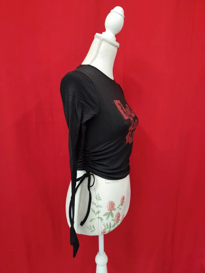 Jennyfer Tee-shirt court à motif Noir Taille S Neuf avec étiquette (15,99 €) Manches longues Lien de coté pour froncer 95% coton 5% élasthanne Longueur: 47 cm Taille poitrine à plat: 36 cm #jennyfer #teeshirtnoircourt #croptop ADN.298