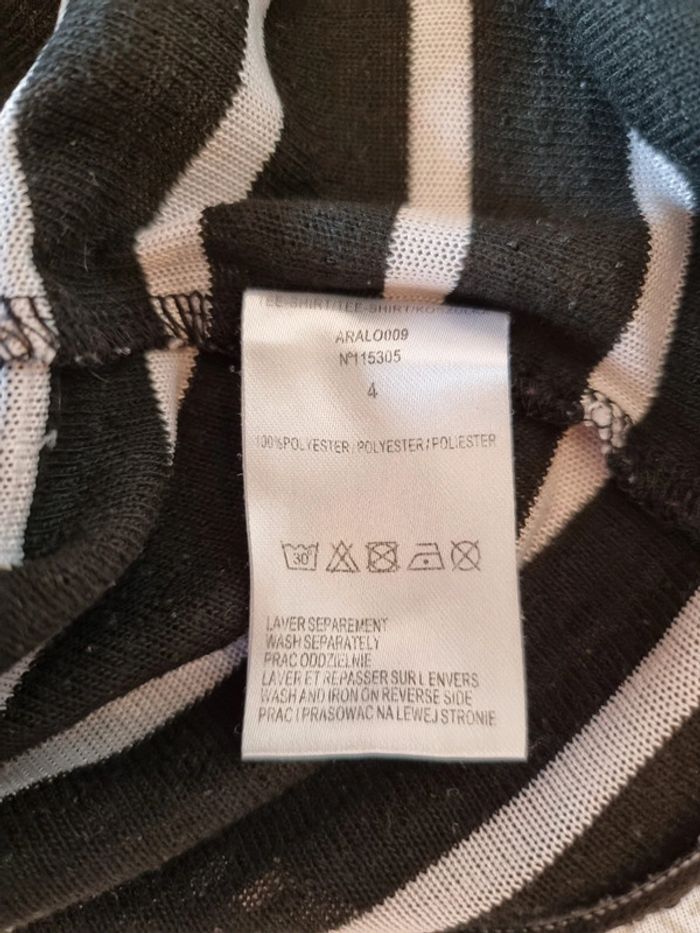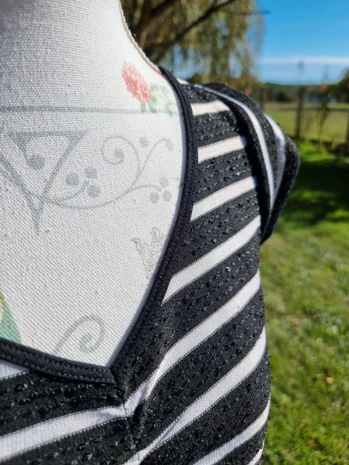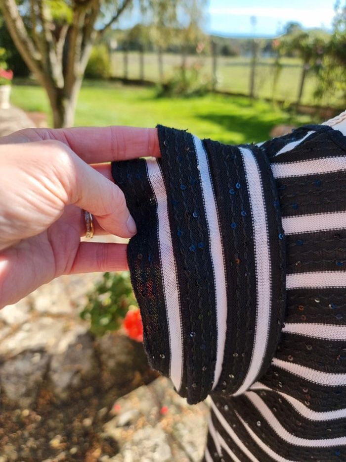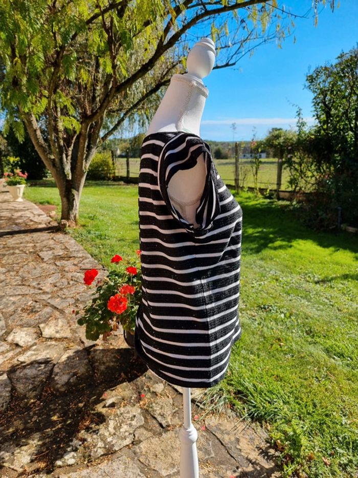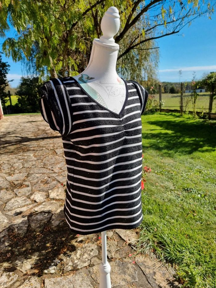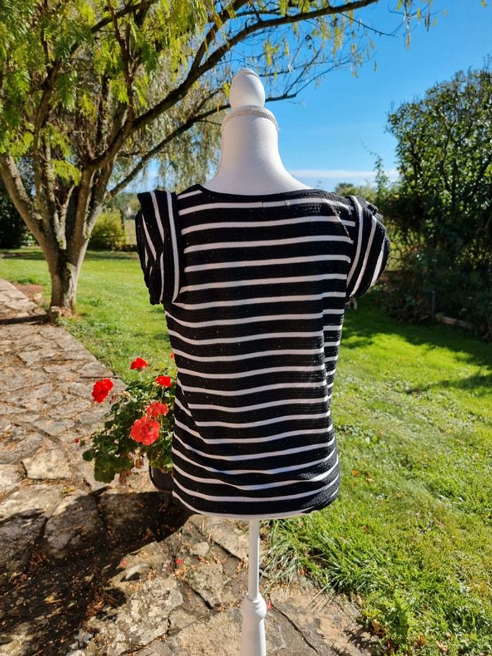 Jacqueline Riu Haut fines mailles Taille 4 (40/42) Noir et blanc rayé Parfait état 100% polyester Petits sequins noirs cousus sur les bandes noires Longueur: 61 cm Taille poitrine à plat: 49 cm #jacquelineriu #mariniere40 V.G.1