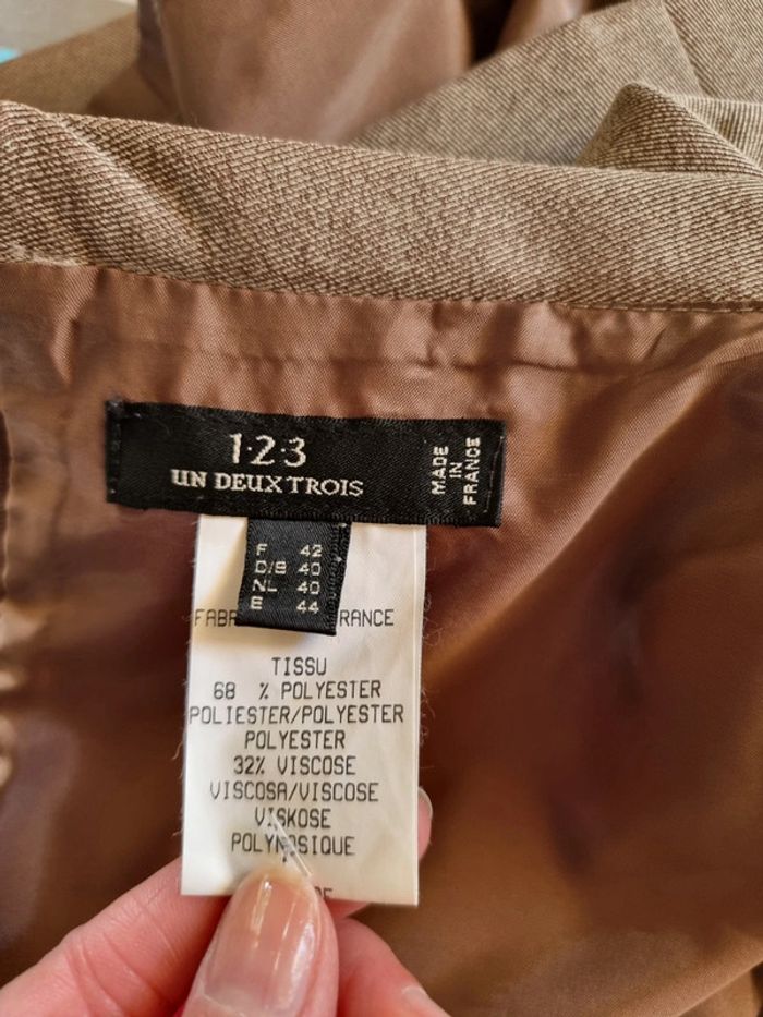Maison 1.2.3 Jupe marron clair élégante Taille 42 (taille petit) Entièrement doublée Parfait état 2 poches coté Fermeture éclair dans le dos 68% polyester 32% viscose Doublure 100% polyester Longueur: 47 cm Taille à plat: 36 cm #123 #jupemarron PB.1