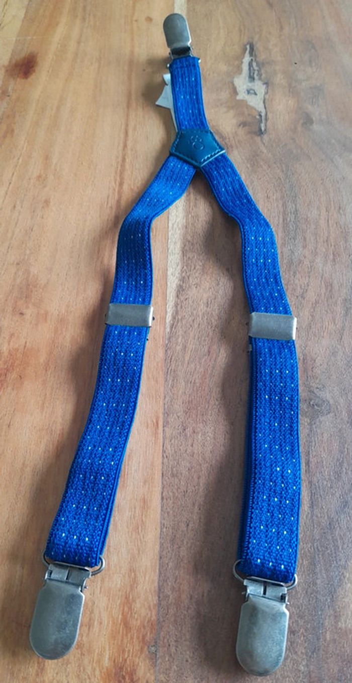 Elastiquées et réglables, ces bretelles sont aussi utiles que trendy dans un look de garçon. Clips faciles à fermer et à ouvrir. A coordonner avec un jean, un pantalon chic ou un bermuda, quelle que soit la saison. Bon état. T.U