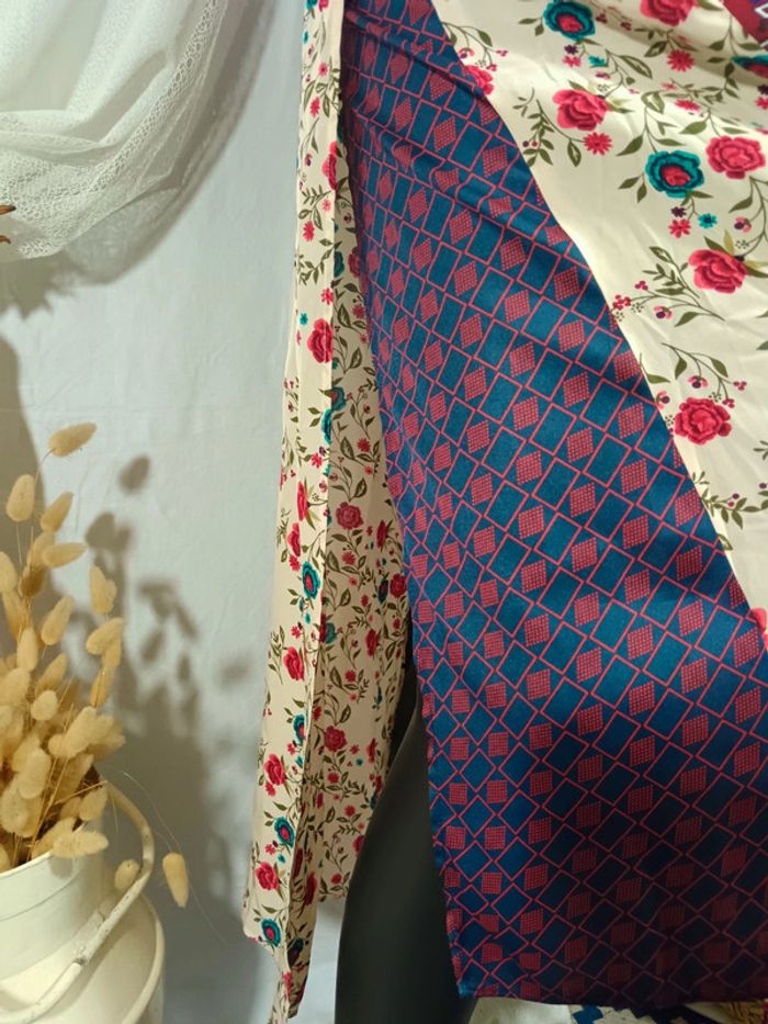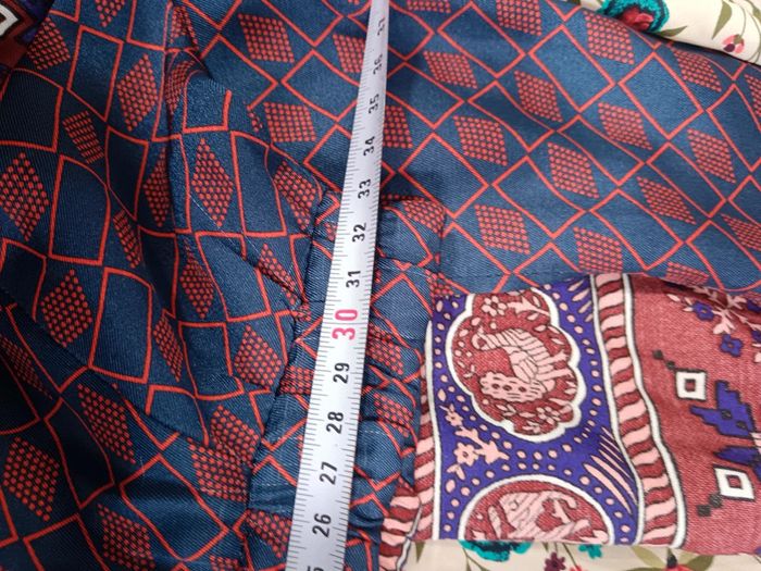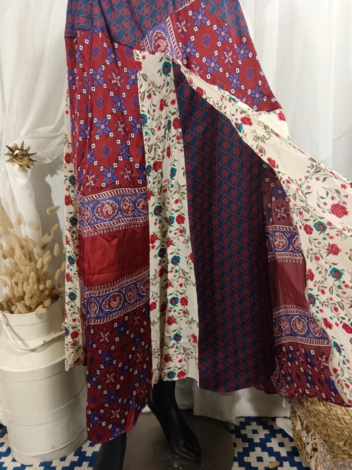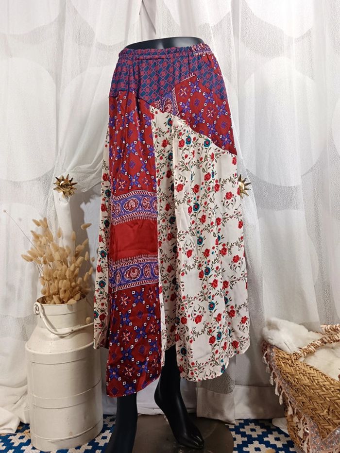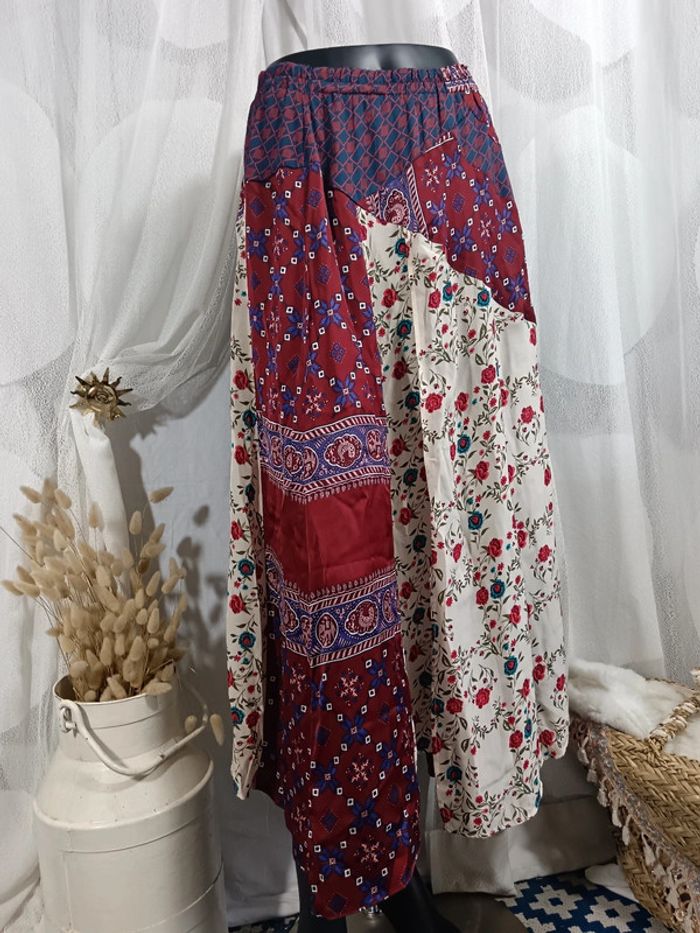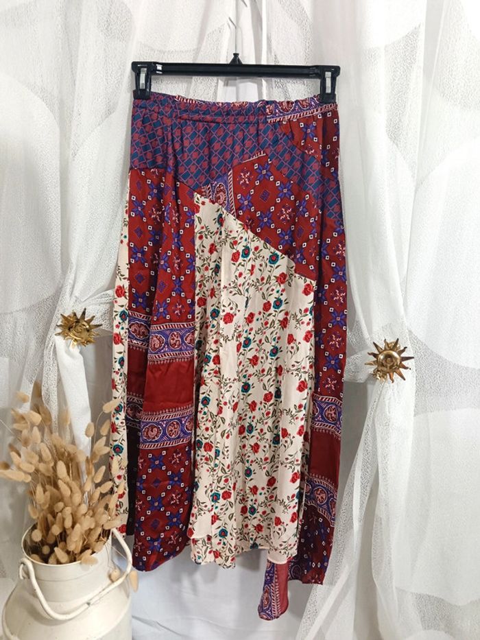 Jupe bohème Sandro. Tissus patchwork à motifs différents (florale, pied de poule et géométrique). Effet tissus ouvert. A l'avant et à l'arrière. Élastique à la taille. Asymétrie, jeu de longueur. Arrive aux chevilles. En viscose. Effet satin #calm38 #calm40 #jupeboheme #jupesandro