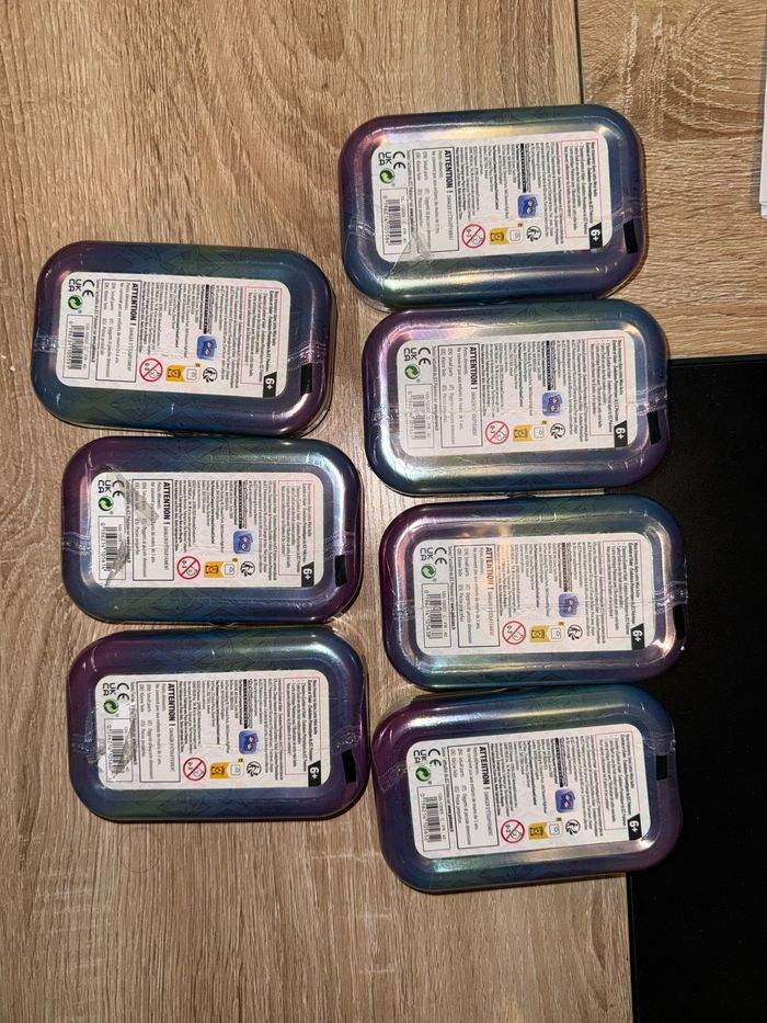 Bonjour, Je vend ce lot de 7 mini tins ev8,5 - Evolutions Prismatiques Seule l’illustration Noctali manque Scellage mitigé sur certaines voir photos Main propre sur Montpellier Possible