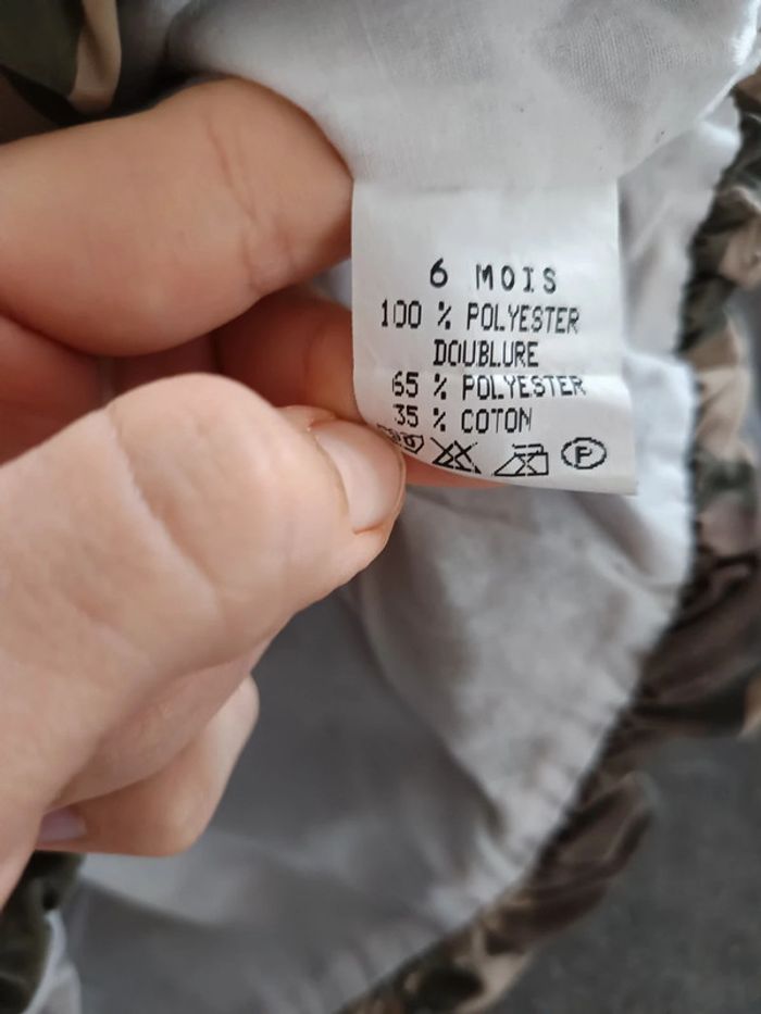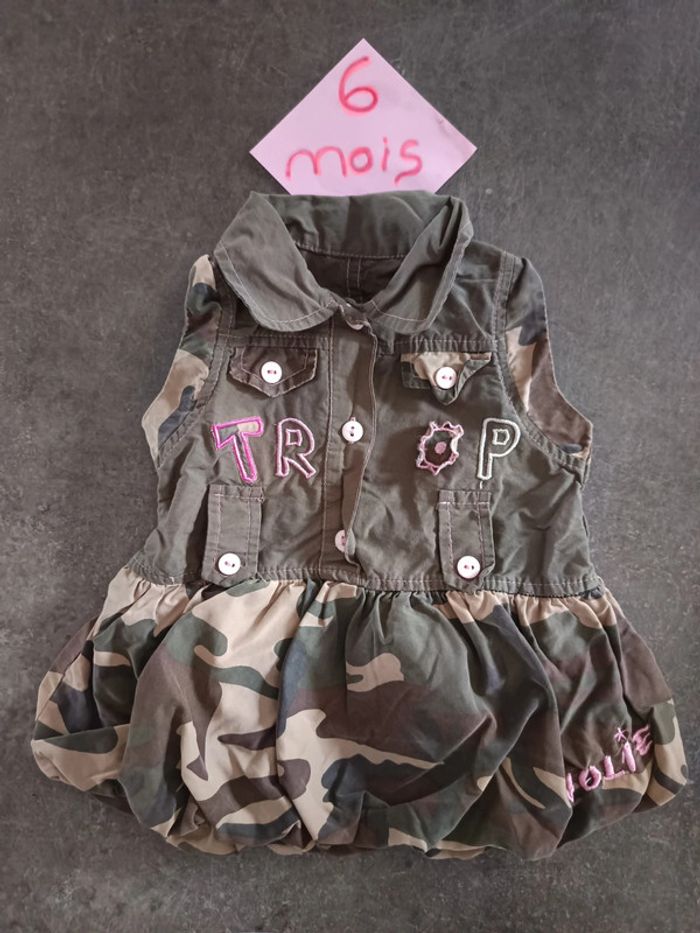 Robe sans manches, Imprimé militaire et inscription "trop" Très bon état Taille 6 mois #vetementbebefille6moisjustine182129