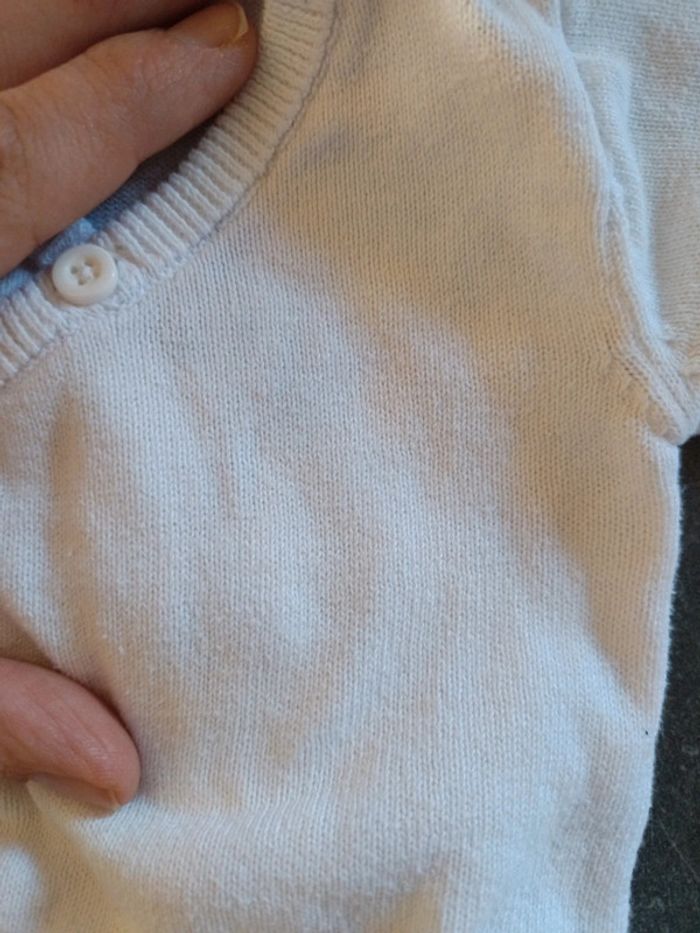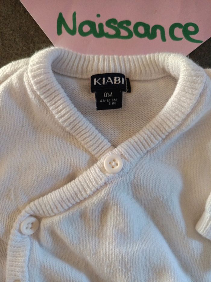 Gilet croisé blanc, En bon état, car petites tâches bleues à peine visibles. Taille 0 mois #vetementbebefille0moisjustine182129 #vetementmixtejustine182129