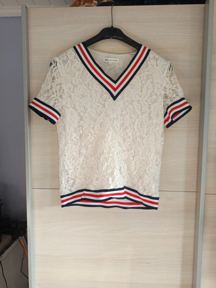 Haut en dentelle manches courtes, Blanc avec lignes bleues marines, rouges et blanches, Très bon état, Taille S #vetementfemmeSjustine182129