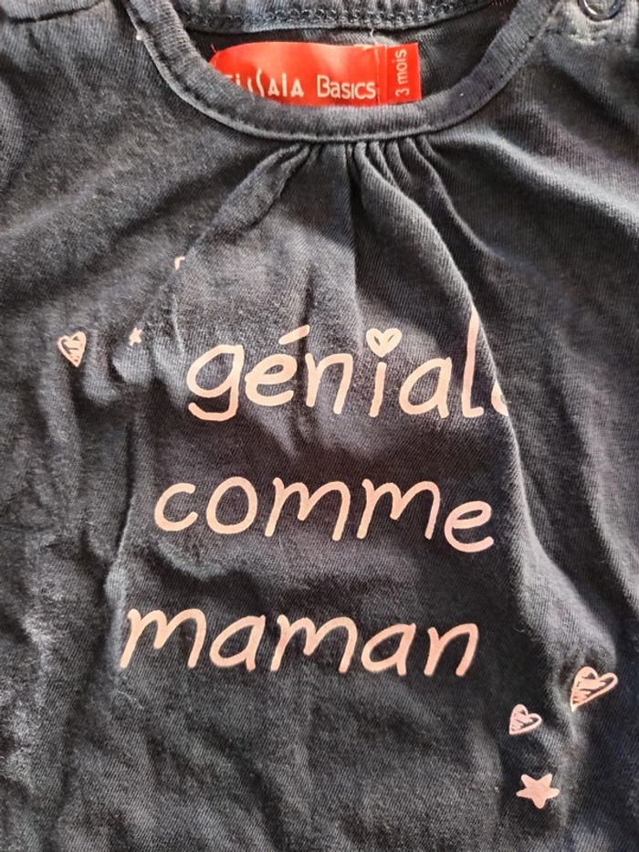 T-shirt manches courtes bleu marine avec inscription "géniale comme Maman" EXCELLENT état, porté une ou 2 fois ! Taille 3 mois #vetementbebefille3moisjustine182129